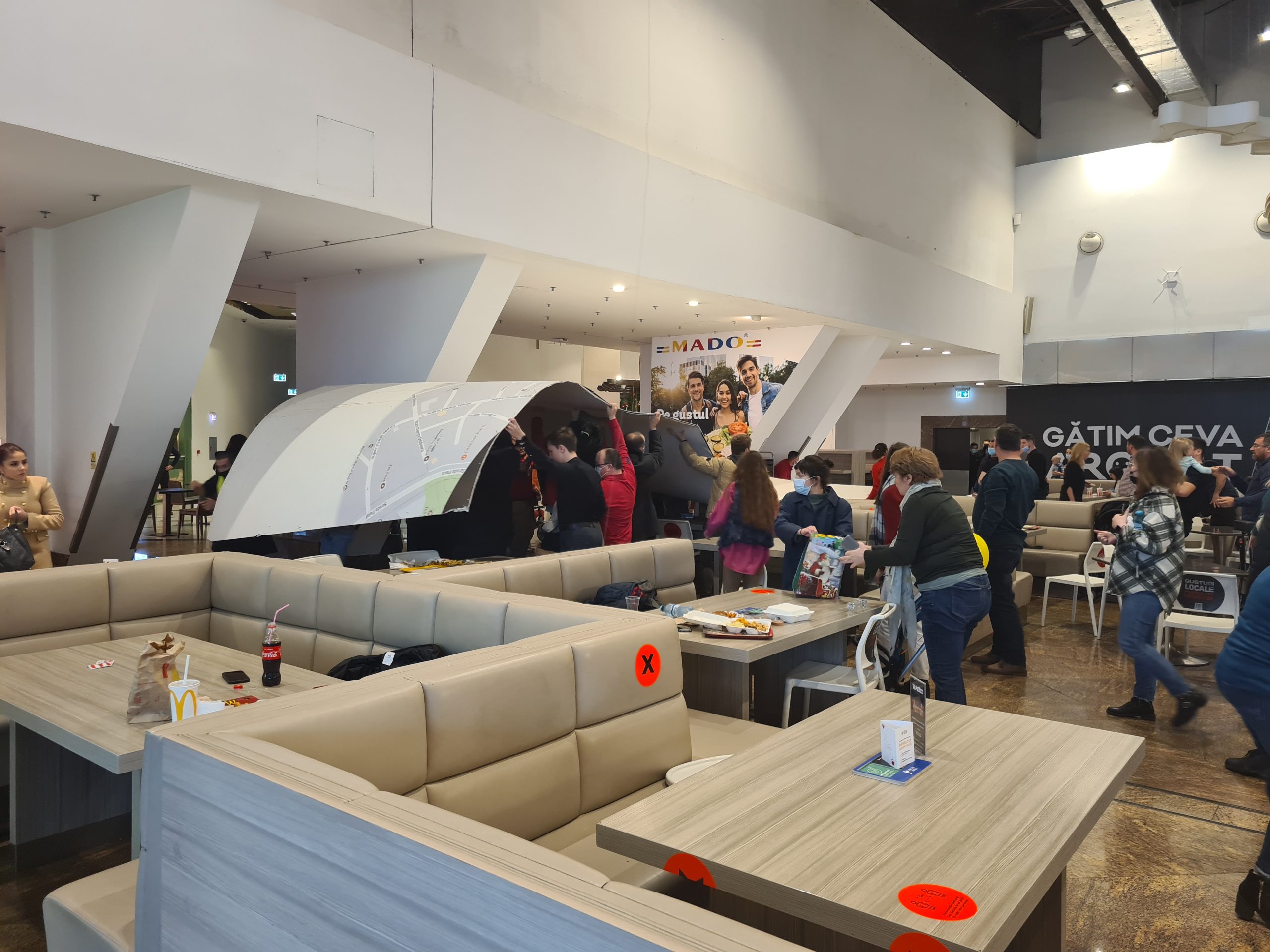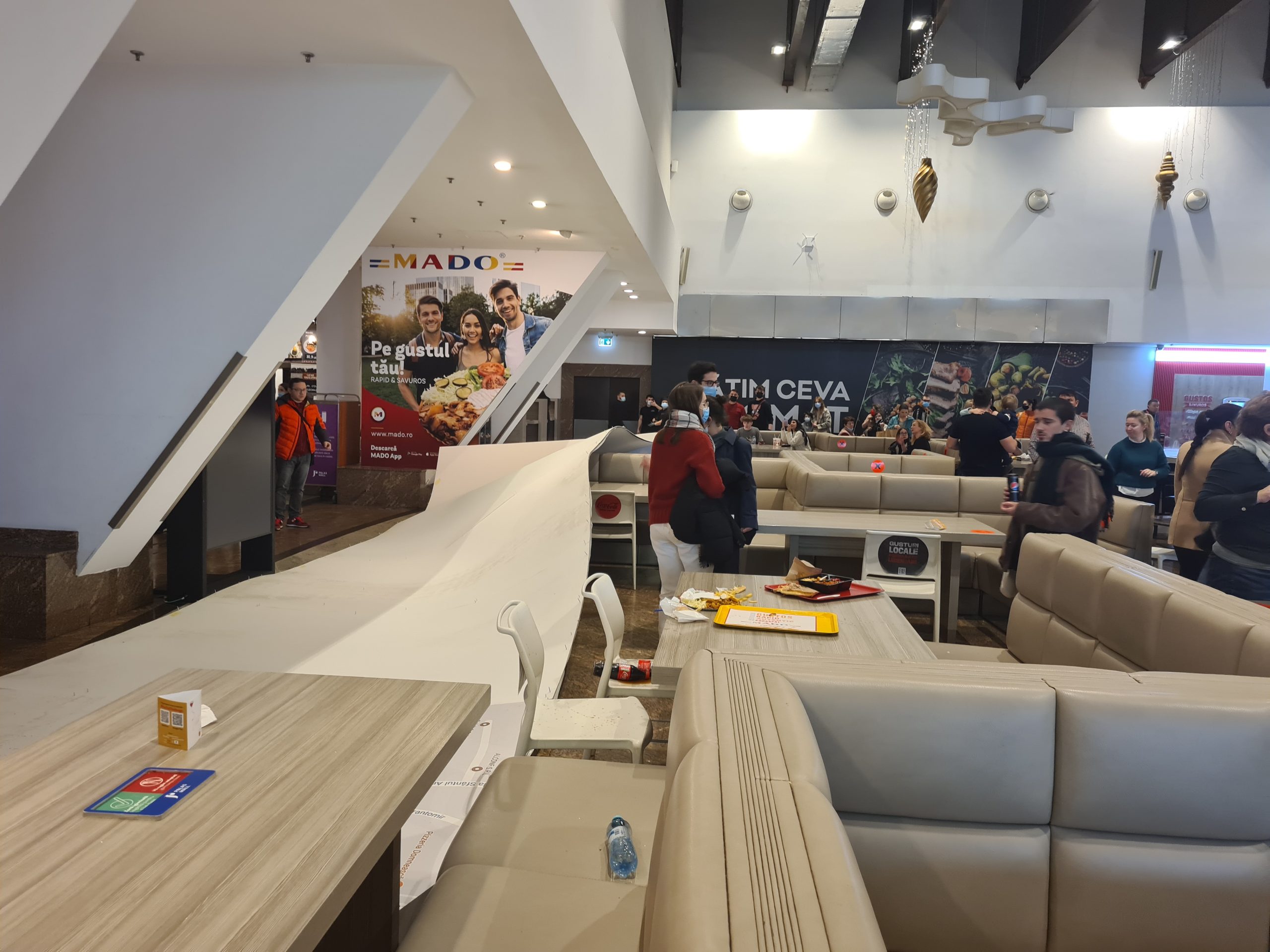 Un imens panou publicitar a cazut in urma cu câteva minute în Palas peste clienții care serveau liniștiți masa în zona de Food Court. Zeci de clienți au tras o sperietură zdravănă. Deocamdată nici un client nu s-a plâns ca ar fi fost rănit. Panoul a cazut și peste un copilaș care servea masa impreuna cu părinții săi. Ceilalți clienți au sărit sa-i ajute pe cei peste care a căzut panoul (foto).