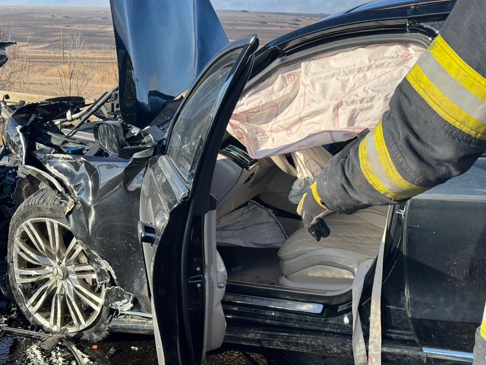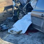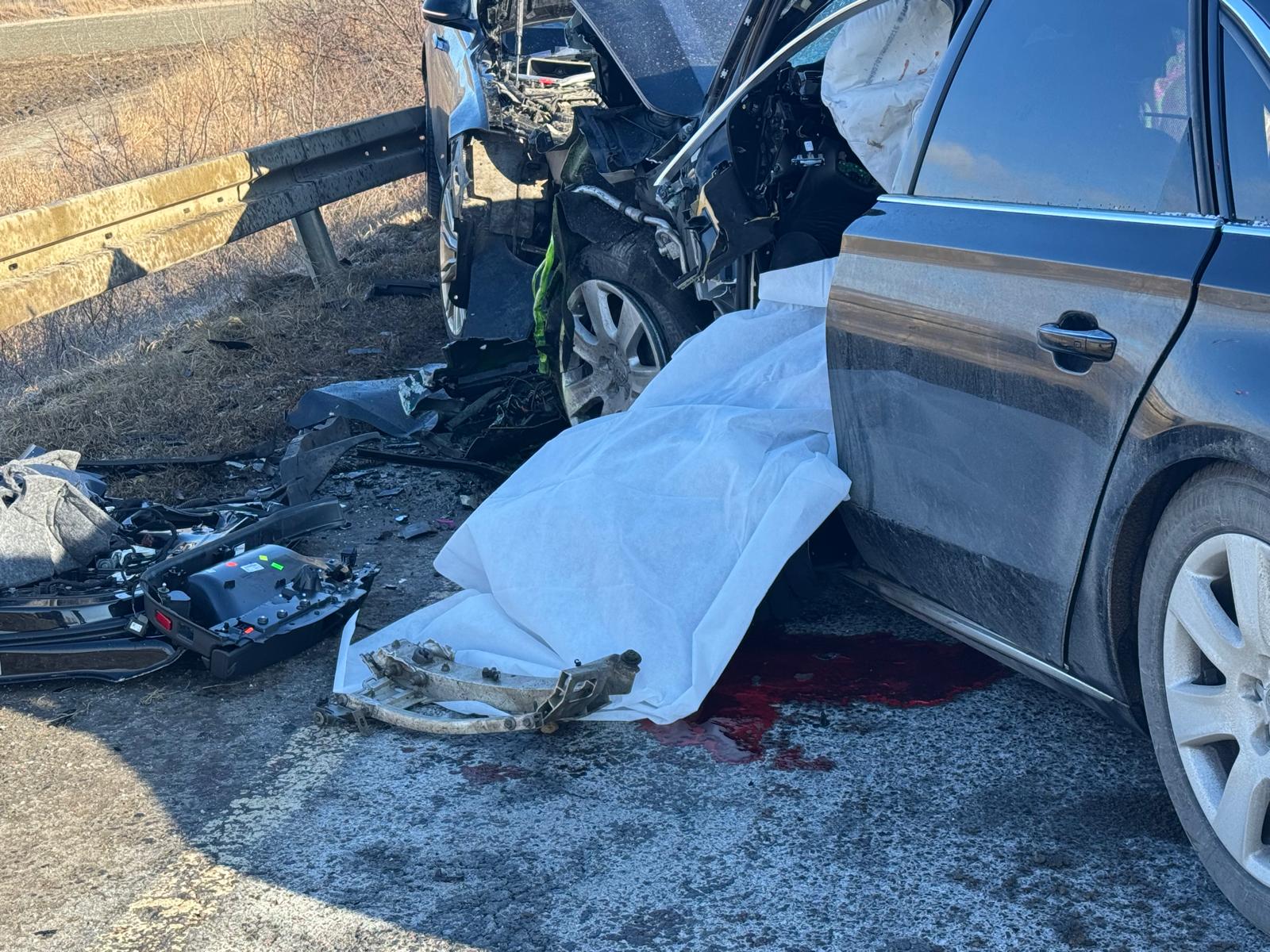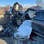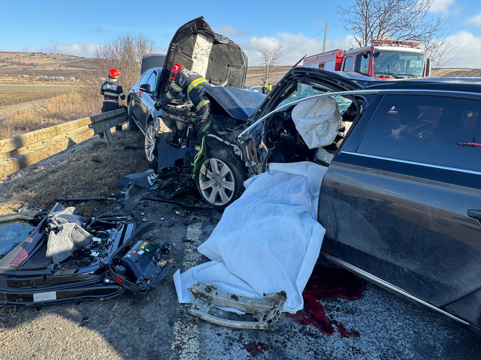 UPDATE 2 – Un șofer de 35 de ani este conștient și are doar contuzii, celălalt conducător auto, de 40 de ani, a decedat, iar pasagera din dreapta față, o femeie de 35 de ani, gravidă, a fost încarcerată și se află în stare gravă, intubată și instabilă hemodinamic.