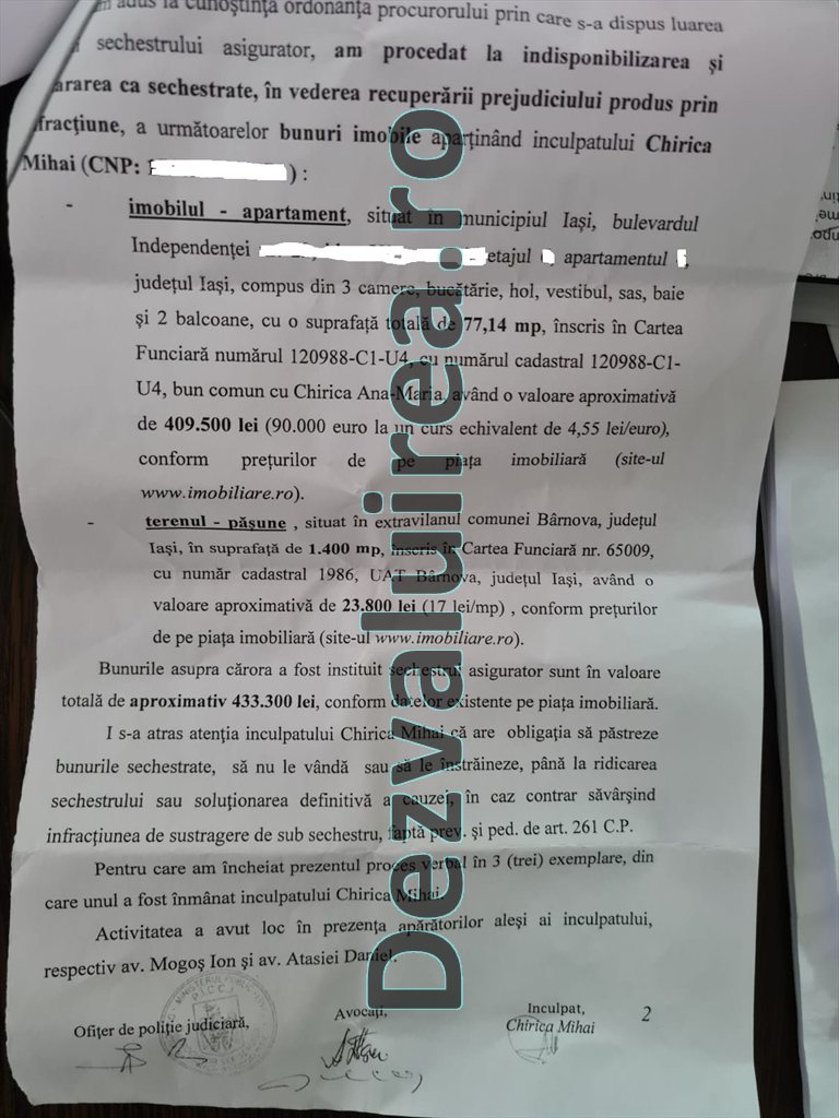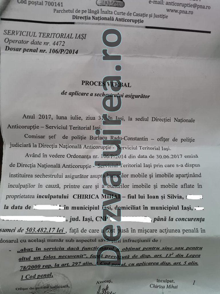 După cum spuneam mai sus, în acest dosar inregistrat la DNA Iasi cu nr.106/P/2014 procurorii anticoruptie au instituit sechestre pe 31 iulie 2017 iar dosarul nu a fost inchis dupa cum sustine Chirica ci, la data de 13 iunie 2019, a fost declinat la Parchetul de pe lângă Judecătoria Iaşi cu propunere de continuare a urmaririi penale. Asta deoarece urmarirea penala incepuse la DNA. Dupa cum arata si documentele pe care le prezentam in facsimil lui Mihai Chirica i s-a pus sechestru pe un apartament cu 3 camere de pe bulevardul Independentei si pe un teren in suprafata de 1.400 mp situat in Barnova. Complicilor lui Chirica le-au fost sechestrate printre altele conturile bancare. Valoarea bunurilor sechestrate lui Chirica este de 433.300 lei.