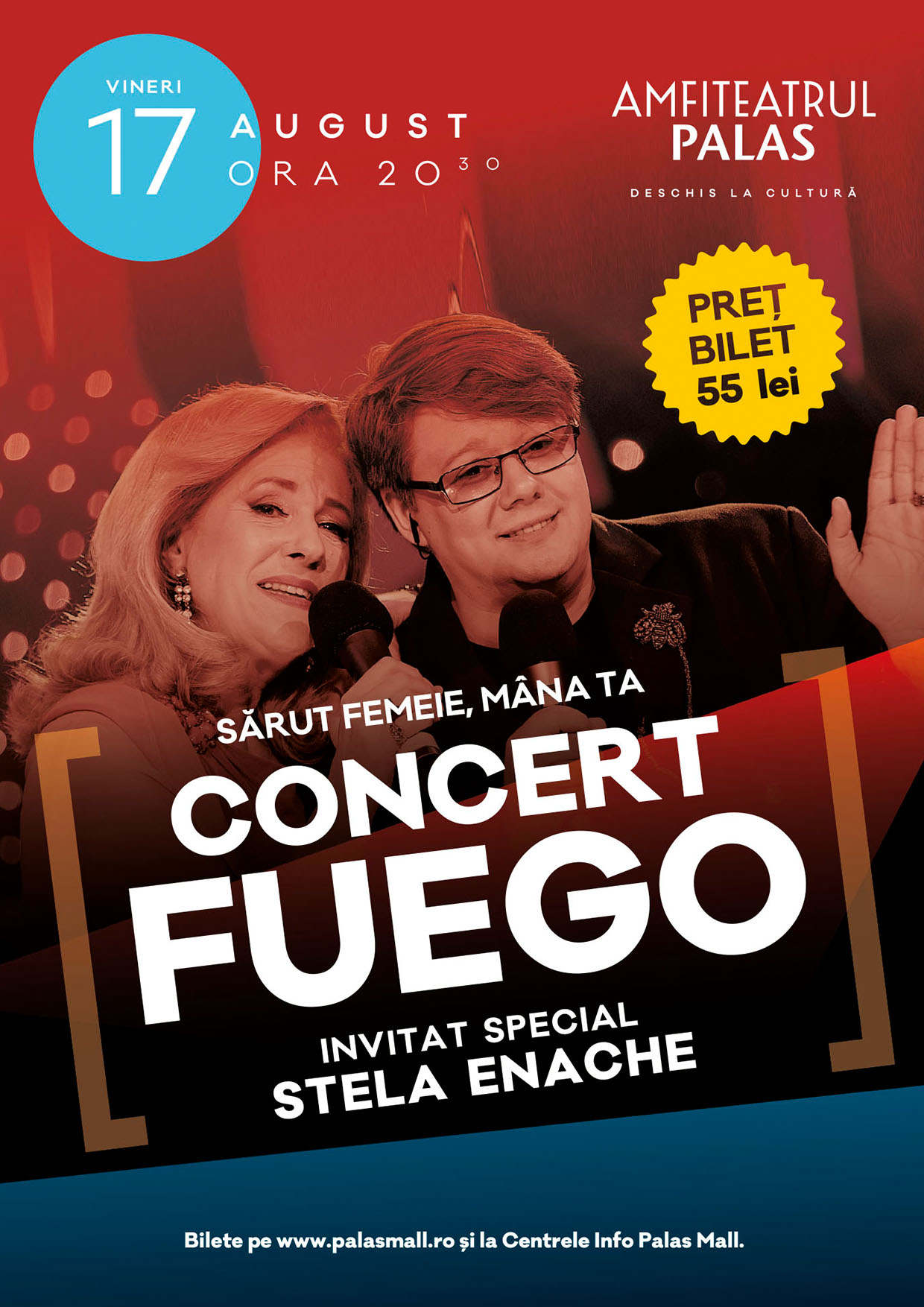 Vineri, pe 17 august 2018, de la ora 20.30, pe scena Amfiteatrului Palas va urca un invitat special, Fuego. Interpretul va încânta publicul cu un show complet, în care vor fi fredonate cele mai îndrăgite melodii ale sale, de o sensibilitate aparte. Nostalgicii și cei care apreciază muzica cu mesaj vor asculta live piesa „Sărut, femeie, mână ta!” și alte cântece la fel de cunoscute. Alături de Fuego va fi și Stela Enache, o voce care a scris pagini importante ale muzicii românești. În compania celor doi artiști iubiți, spectatorii se vor bucura de o seară de neuitat, a cărei vedetă este muzica.