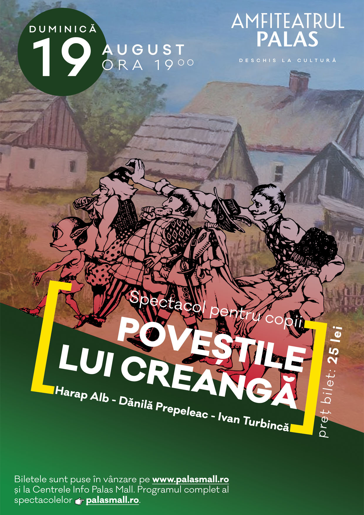 Duminică este timpul ca prichindeii să aibă parte de distracție. Pe 19 august, de la ora 19.00, puștii vor afla „Poveștile lui Creangă”. Ștrengarii vor descoperi întâmplările de care au avut parte Harap Alb, Ivan Turbincă și Dănilă Prepeleac, într-o singură piesă de teatru susținută de Ateneul Copiilor din Cluj-Napoca. Cei mici vor fi parte a unui spectacol colorat și muzical, în care actorii cântă, dansează și stârnesc hohote de râs.
