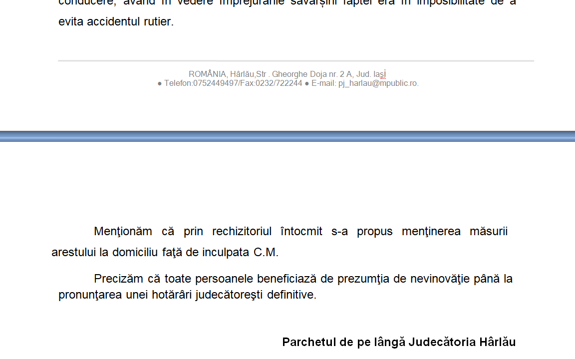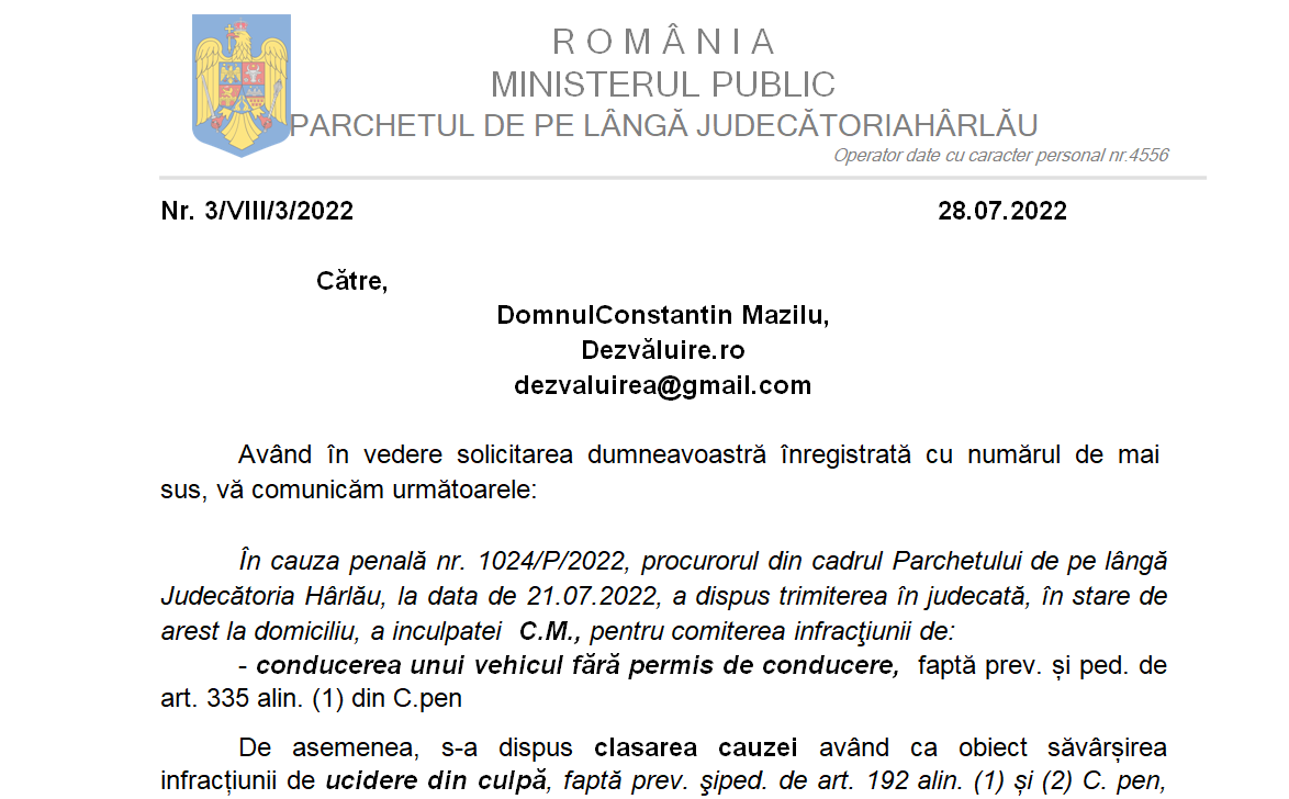Este oficial! Mariana Coșofreț, femeia care în data de 1 iunie a condus fara permis nu va fi acuzata si de ucidere din culpă. Intr-un raspuns transmis Dezvaluirea.ro, procurorii Parchetului de pe langa Judecatoria Harlau au transmis ca au clasat acuzatiile de ucidere din culpa confirmand ceea ce am aratat inr-o editie anterioara si anume faptul ca Mariana Cosofret va fi acuzata doar de conducere fara permis (foto un pagina raspuns parchet). Procurorii sustin ca Mariana Cosofret nu ar fi putut evita accicentul chiar daca ar fi condus având permis de conducere. ‘’La data de 01.06.2022, orele 18:37, inculpata C.M., în timp ce conducea autoturismul marca VW, pe DS 516 în localitatea Sticlăria, comuna Scobinți, județul Iași, fără a deține permis de conducere pentru nicio categorie de vehicule, a acroșat cu partea din stânga față a autovehiculului pe minora D. E.-A., de 4 ani, care se juca împreună cu un grup de copii pe drum și care a alergat să traverseze strada, prin loc nepermis, prin spatele unui autoturism (TAXI) marca Dacia, oprit pe sensul opus de mers, accident în urma căruia, minora a decedat. Producerea evenimentului rutier nu poate fi imputată acesteia, deoarece între conducerea autoturismului fără a deține permis de conducere și moartea victimei nu există legătură de cauzalitate. Și în situația în care inculpata ar fi deținut permis de conducere, având în vedere împrejurările săvârșirii faptei era în imposibilitate de a evita accidentul rutier‘’, au aratat procurorii din Hârlău pentru Dezvaluirea.ro.