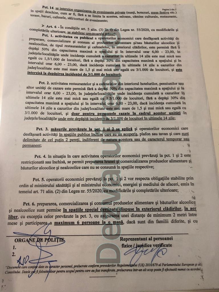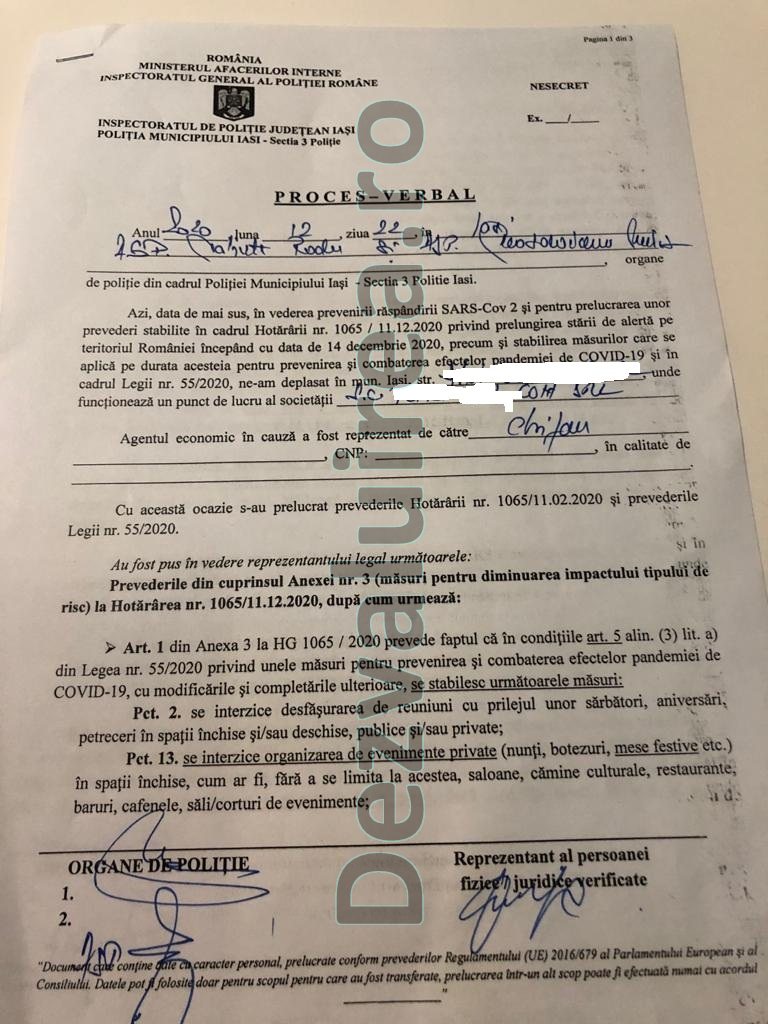 Putem sau nu sa spunem ca o sa avem petrecere de Revelion anul acesta? Punem semn de intrebare deoarece Ministerul Administratiei si Internelor a emis in acest sens un document destul de ambiguu. Astfel, in aceasta perioada agentii de politie din cadrul IPJ Iasi cutreiera restaurantele pentru a informa managerii in legatura cu conditiile in care pot functiona restaurantele in seara de 31 decembrie. Politiștii semnează cu managerii restaurantelor un proces verbal în care aceștia din urmă iau la cunoștința despre conditiile de functionare a restaurantelor in seara respectiva. Prezentam in fotocopie un exemplar dintr-un astfel de proces verbal. In primul rand, in toate situatiile, in seara zile de 31 decembrie restaurantele pot functiona numai pana la ora 23.00. Prima reglementare se refera la unitatile de tip restaurant care nu ofera si cazare. Acestea pot fi umplute la 50 la suta din capacitate daca incidenta cazurilor Covid in localitatea respectiva este mai mica de 1,5 la mie si la 30 la suta daca incidenta este cuprinsa intre 1,5 la mie si 3 la mie. Daca limita de 3 la mie este depasita funcționarea restaurantelor nu este permisă. „Activitatea cu publicul a operatorilor economici care desfășoară activități de preparere comercializare și consum a produselor alimentare si/sau bauturilor alcoolice de tipul restaurantelor si cafenelelor este permisa fara a se dapăși 50 la suta din capacitatea maxima a spatiului si in intervalul orar 6.00-23.00 in judetele localitatile unde incidenta cumulata a cazurilor in ultimele 14 zile este mai mica sau egala cu 1,5/1.000 de locuitori, fara a depăși 30 la suta din capacitatea maxima a spatiului si in intervalul orar 6.00-23.00 , daca incidenta cumulata din ultimele 14 zile a cazurilor din judet /localitate este mai mare de 1,5 si mai mica sau egala cu 3/100 de locuitori si este interzisa la depasirea incidentei de 3/1.000 locuitori”, se arata in document.