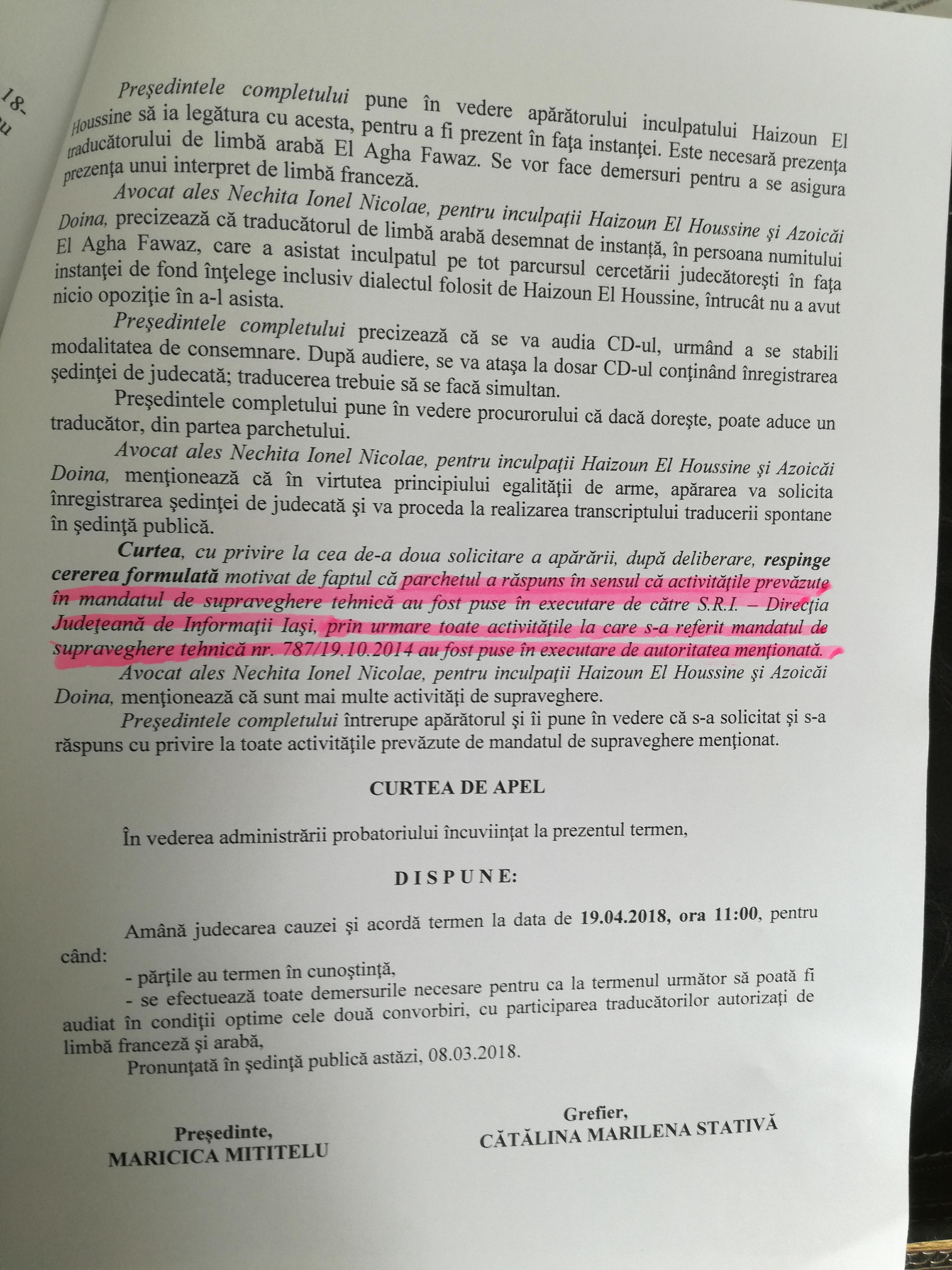 Dialog intre surzi in sala de judecata. Intentia magistratilor si a avocatilor apararii de a asculta in sedinta publica inregistrarile ambientale realizate de Serviciul Roman de Informatii in dosarul in care Doina Azoica, fostul decan al Facultatii de Medicina de la UMF Iasi, au fost sortite esecului. Desi la audieri a participat un specialist in tehnica audio, inregistrarile ambientale nu au putut fi ascultate deoarece sunt neclare. Unul dintre traducatorii solicitati de instanta (unul pentru limba marocana si un altul pentru franceza) le-a spus judecatorilor ca nu intelege decat franturi de fraza. Faptul ca aceste inregistrari au fost realizate de Serviciul Roman de Informatii- Directia Judetena Iasi a fost consemnat intr-una din incheierile de sedinta care s-au desfasurat in acest dosar de coruptie. Prezentam in fotocopie documentul respectiv. Pentru ca nu au putut fi audiate in sedinta publica magistratii Curtii de Apel Iasi au decis astazi ca cei doi traducatori sa primeasca pe CD inregistrarile realizate de SRI. De altfel, reprezentantul DNA stia ca inregistrarile sunt neclare si a solicitat ca acestea sa fie audiate in casti. Instanta a respins cererea dar dupa tentativa esuata de audiere a decis ca cei doi traducatori sa primeasca cate un CD cu inregistrarile respective si sa scrie transcrierea pe o foaie pe care sa o prezinte instantei la termenul urmatorul.