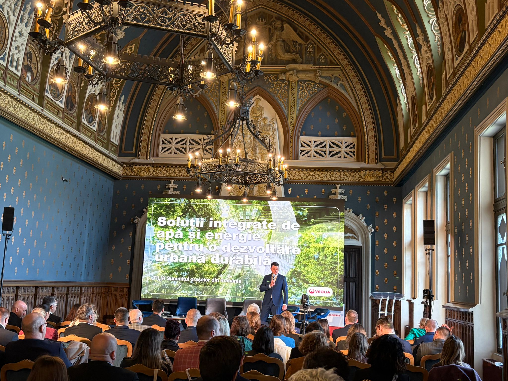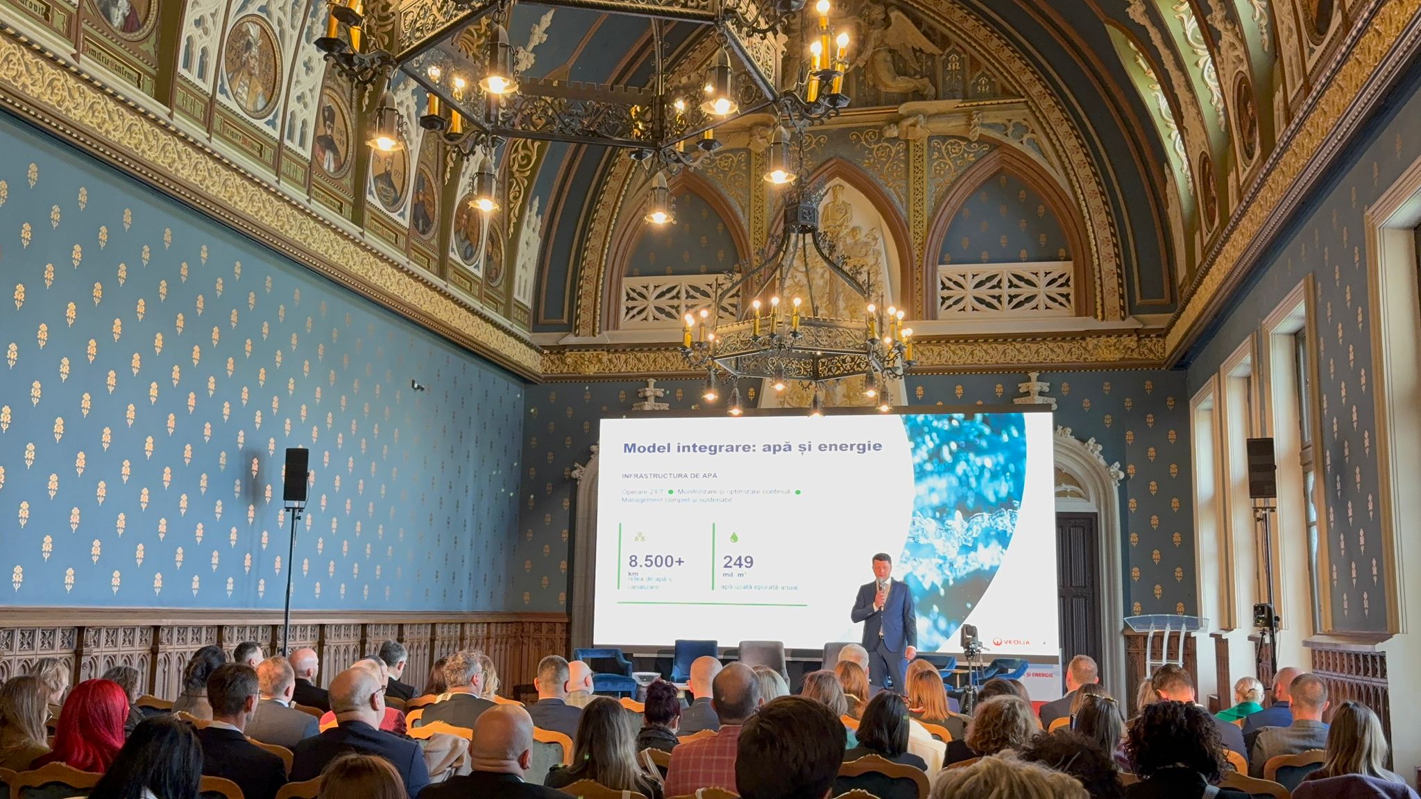 Când vorbim despre aceste resurse, despre infrastructura urbană, credem că, în prezent, discuția nu mai este despre consumuri, despre creșterea consumurilor, despre garantarea consumurilor, ci, mai degrabă, vorbim despre controlul acestora. Despre controlul costurilor, trăim într-o lume dificilă, într-o lume în care crizele se succed, de la războaie până la diverse situații care ne afectează performanțele de zi cu zi, cele ale unui consum eficient la nivel individual, dar mai ales la nivel general și la nivelul municipalităților. De asemenea, un subiect care ne preocupă și ne afectează securitatea tuturor este cel al dependenței de resursele externe, de factori externe. Prin urmare, toate soluțiile pe care Veolia le urmărește și le propune se bazează pe resurse locale, pe valorificarea ceea ce există la un nivel de performanță cât mai ridicat. Câteva cifre despre prezența Veolia în România.  În cei peste 25 de ani de prezență în România au fost realizate investiții în infrastructura de armă și energie de aproximativ 2,3 miliarde de euro, deci avem o medie undeva în jurul valorii de 100 de milioane de euro pe an. În prezent suntem peste 3.600 de angajați. Aici vreau să notez faptul că valoarea companiilor locale este în creștere. Am achiziționat în ultimii doi ani două companii autentic românești în segmentul de energie și în prezent este de peste 2 milioane de utilizatori. În ceea ce crește infrastructura de apă și apă uzată, ne uităm în primul rând la zona de protecție a meniului, sistemele de alimentare cu apă, stațiile de tratare, dar mai ales sistemele de epurare sunt cele care ridică la nivelul municipalităților, dar și la nivelul consumatorilor privați, industriali, cele mai multe probleme zilele noastre. Exigențele noastre cresc, nevoia de protecție a meniului, ca urmare a revoluției industriale, ca urmare a progreselor tehnologice, atât în zona de IT și în alte segmente economice, impune noi și noi tehnologii în această privință. Suntem gata să le oferim și să venim cu astfel de propuneri, deopotrivă către clienții privați, cât și către cei industriali. În ceea ce privește infrastructura de energie, vă spuneam în început faptul că ne uităm către zona de surse regenerabile. Două componente sunt esențiale la nivel mondial. Una este cea a producției de energie electrică, care prezintă și care contribuie astăzi cu peste 40% din emisiile de gaze cu efect de seră, iar cealaltă componentă, cam pe aceiași pontele de 40%, o reprezintă energia termică. Prin urmare, controlul acestor surse de poluare, investițiile în astfel de soluții tehnologice care au menirea să reducă emisiile de gaze, considerăm că sunt cele mai importante”, a explicat Valentin Zaharia, Director Tehnic și Performanță Veolia România.
