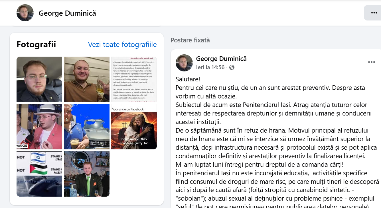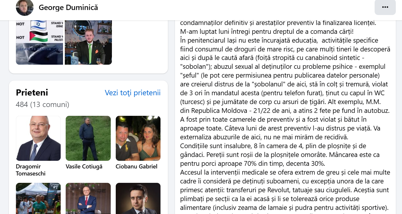Un alt deținut, George Duminică a reușit să posteze pa pagina sa de Facebook, ororile din Penitenciarul Iași. Acesta a intrat în refuz de hrană în urmă cu circa o săptămână pentru că i se refuză accesul la studii de la distanță. În postarea sa acesta vorbește violuri și consum de droguri în Penitenciarul Iași. ‘’ În Penitenciarul Iași nu este încurajată educația,  activitățile specifice fiind consumul de droguri de mare risc, pe care mulți tineri le descoperă aici și după le caută afară (foiță stropită cu canabinoid sintetic – „sobolan”); abuzul sexual al deținuților cu probleme psihice – exemplul „șeful” (le pot cere permisiunea pentru publicarea datelor personale) are creierul distrus de la „șobolanul” de aici, stă în colț și tremură, violat de 3 ori în mandatul acesta (pentru telefon furat), ținut cu capul în WC (turcesc) și pe jumătate de corp cu arsuri de țigări. Alt exemplu, M.M. din Republica Moldova – 21/22 de ani, a atins 2 fete pe fund în autobuz. A fost prin toate camerele de preventiv și a fost violat și bătut în aproape toate. Câteva luni de arest preventiv l-au distrus pe viață. Va externaliza abuzurile de aici, nu ne mai mirăm de recidivă. Condițiile sunt insalubre, 8 în camera de 4, plin de ploșnițe și de gândaci. Pereții sunt roșii de la ploșnițele omorâte. Mâncarea este ca pentru porci aproape 70% din timp, decenta 30%. Accesul la intervenții medicale se ofera extrem de greu și cele mai multe cadre îi consideră pe deținuți suboameni, cu excepția unora de la care primesc atenții: transferuri pe Revolut, tatuaje sau ciuguleli. Aceștia sunt plimbați pe secții ca la ei acasă și li se tolerează orice produse alimentare (inclusiv zeama de lamaie și pudra pentru activități sportive). Restul, trebuie sa lupte zi de zi pentru o pastila, pentru dreptate, în general’’, a postat George Duminică. Vom reveni.