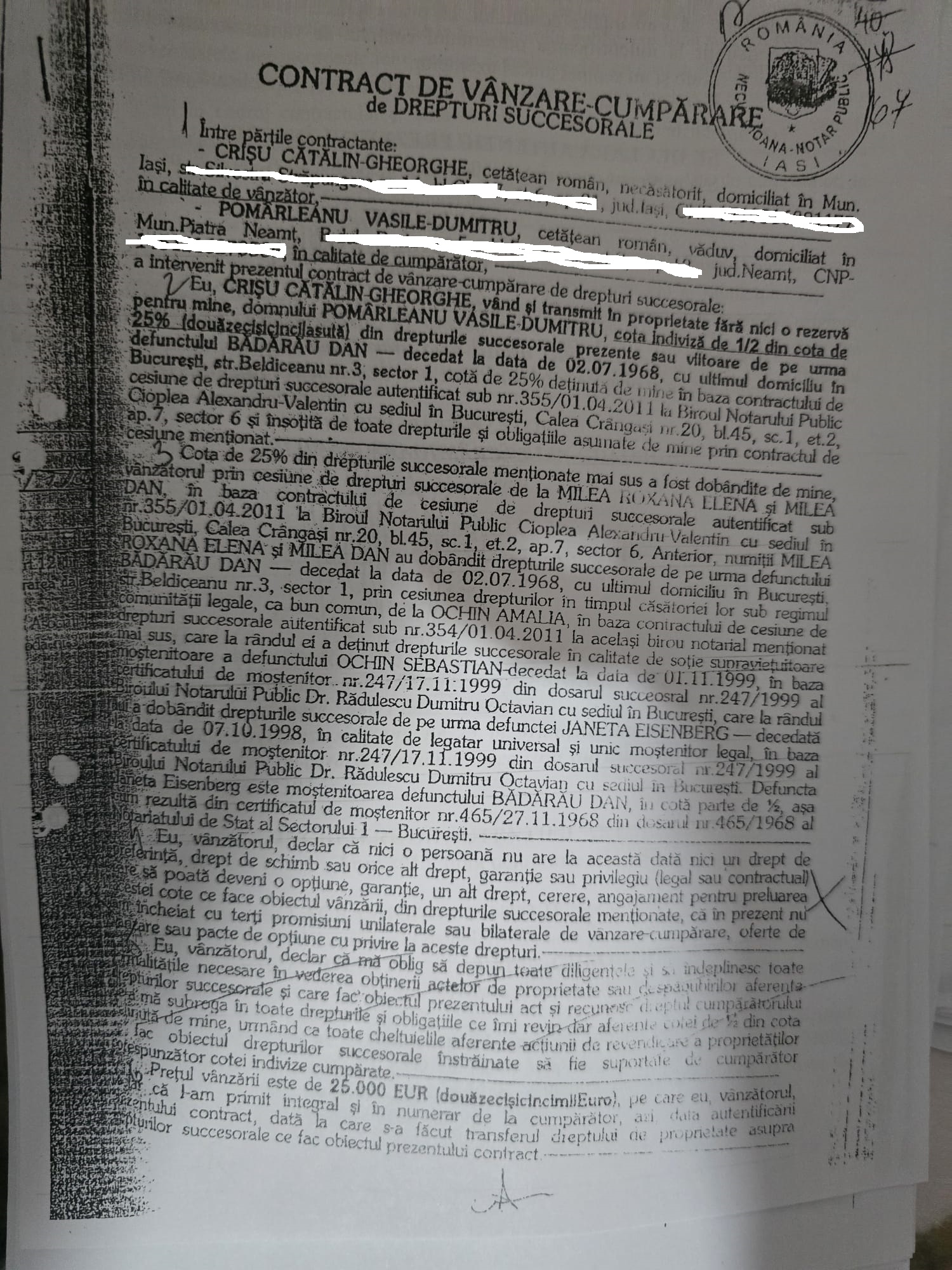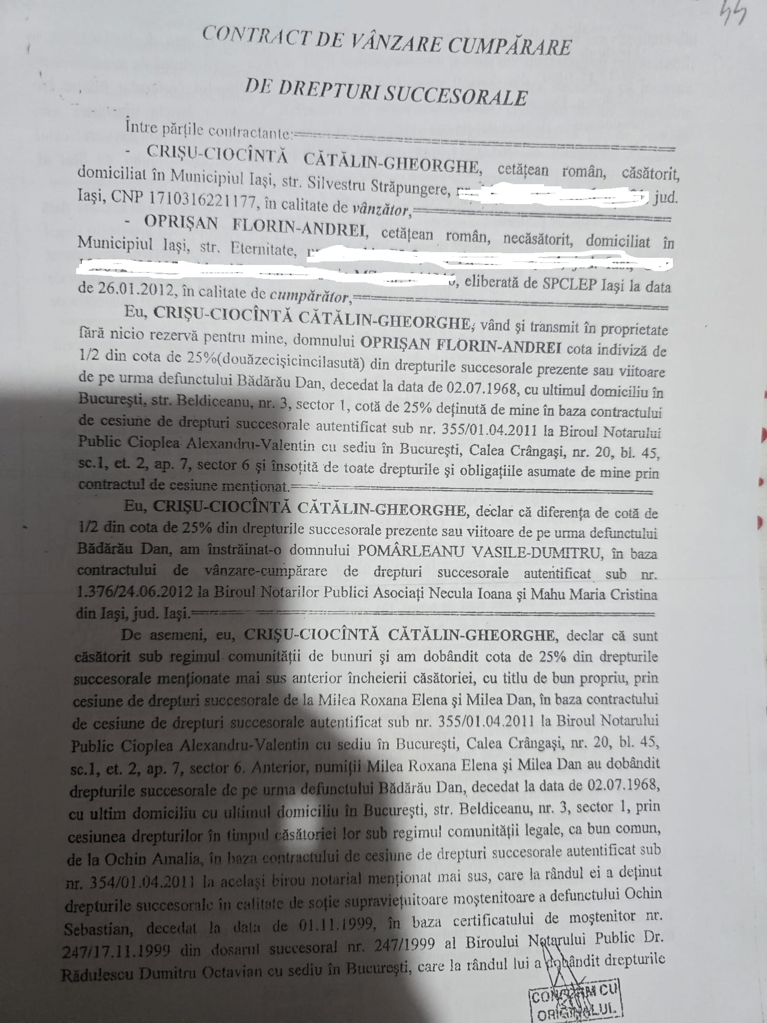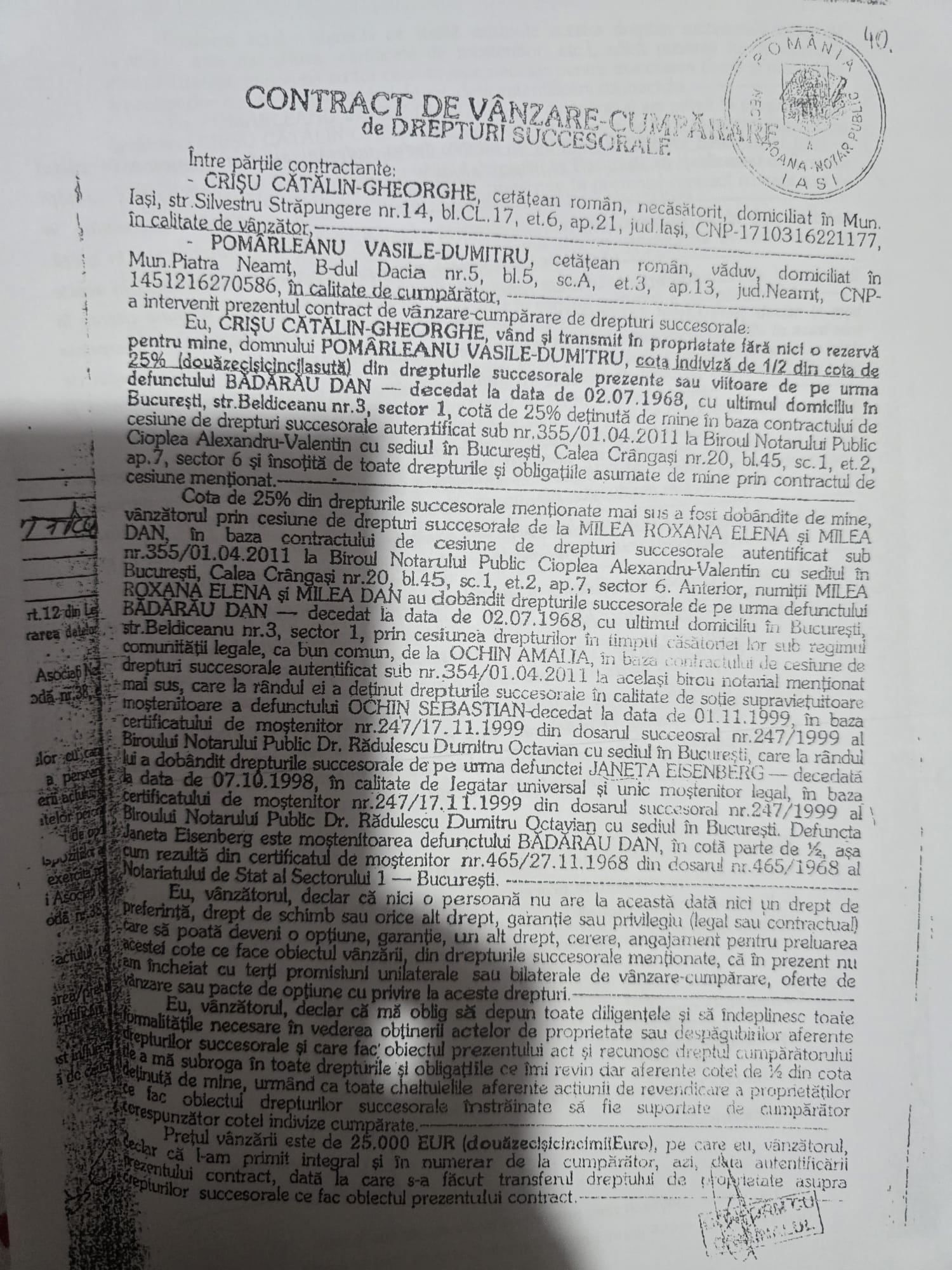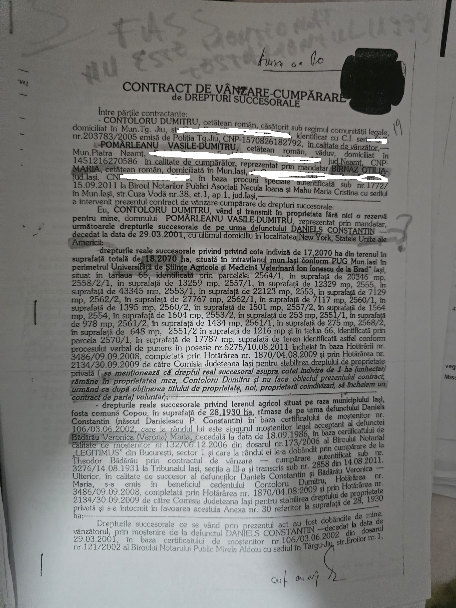 Astfel, ANRP a solicitat printre altele Judecătoriei Iași să constate, nulitatea titlului de proprietate nr.6/19.06.2023 pentru terenul cu vegetație forestieră în suprafață de 10 ha emis de Comisia Județeană de Fond Funciar Iași pentru Simona Missir dar și a titlului de proprietate nr.186465/21.04.2003 pentru terenul în suprafață de 15,892 ha situat în municipiul Iași în favoarea lui Mircea Geanău. În ceea ce privește titlul lui Mircea Geanău acesta a revendicat unele suprafețe moștenite de la Dan Bădărău. Pentru moștenirea lui Dan Bădărău s-au bătut și Bogdan Cihodaru și Cătălin Crișu. În cererea ANRP se arată că la un moment dat și Crișu a obținut în instanță anularea parțială a titlului de proprietate nr.186465/21.04.2003. Cererea ANRP se întinde pe 45 de pagini și este un adevărat ‘’rechizitoriu’’ al ilegalităților făcute de-a lungul timpului cu retrocedarea moșiei Bădărău. ANRP arată că mulți dintre cei care au obținut terenurile nu aveau acest drept, le-au fost retrocedate de două ori, le-au obținut cu acte  false etc. De altfel, în edițiile anterioare am arătat că Bogdan Cihodaru a și fost trimis în judecată de DNA și condamnat la o pedeapsă de 3 ani de închisoare pentru că a obținut cu documente false suprafețe importante în Copou, pe aleea Sadoveanu. De asemenea, Dumitru Contoloru (un alt pretins moștenitor Bădărău) a fost trimis în judecată deoarece i-au fost retrocedate suprafețe importante de teren, cel puțin 18 ha, folosindu-se de un testament fals. Prezentăm în ediția de astăzi, în fotocopie, câteva documente care demonstrează cele arătate mai sus, adică faptul că moșia Bădărău a fost vânată și tranzacționată în ultimii ani de Cihodaru, Crișu, Paul Diaconu și alții. Într-un drept la replică trimis pe adresa redacției Bogdan Cihodaru a spus că acțiunea ANRP nu vizează terenuri din municipiul Iași ceea ce este evident un fals. Acțiunea vizează terenuri pentru care s-au bătut Crișu, Cihodaru și Paul Diaconu. Veți vedea în documentele de mai jos că Paul Diaconu a fost mandatarul lui Mircea Geanău și că Cihodaru a făcut multe tranzacții prin intermediul unchiului său Vasile Pomârleanu care a decedat în urmă cu două săptămâni.