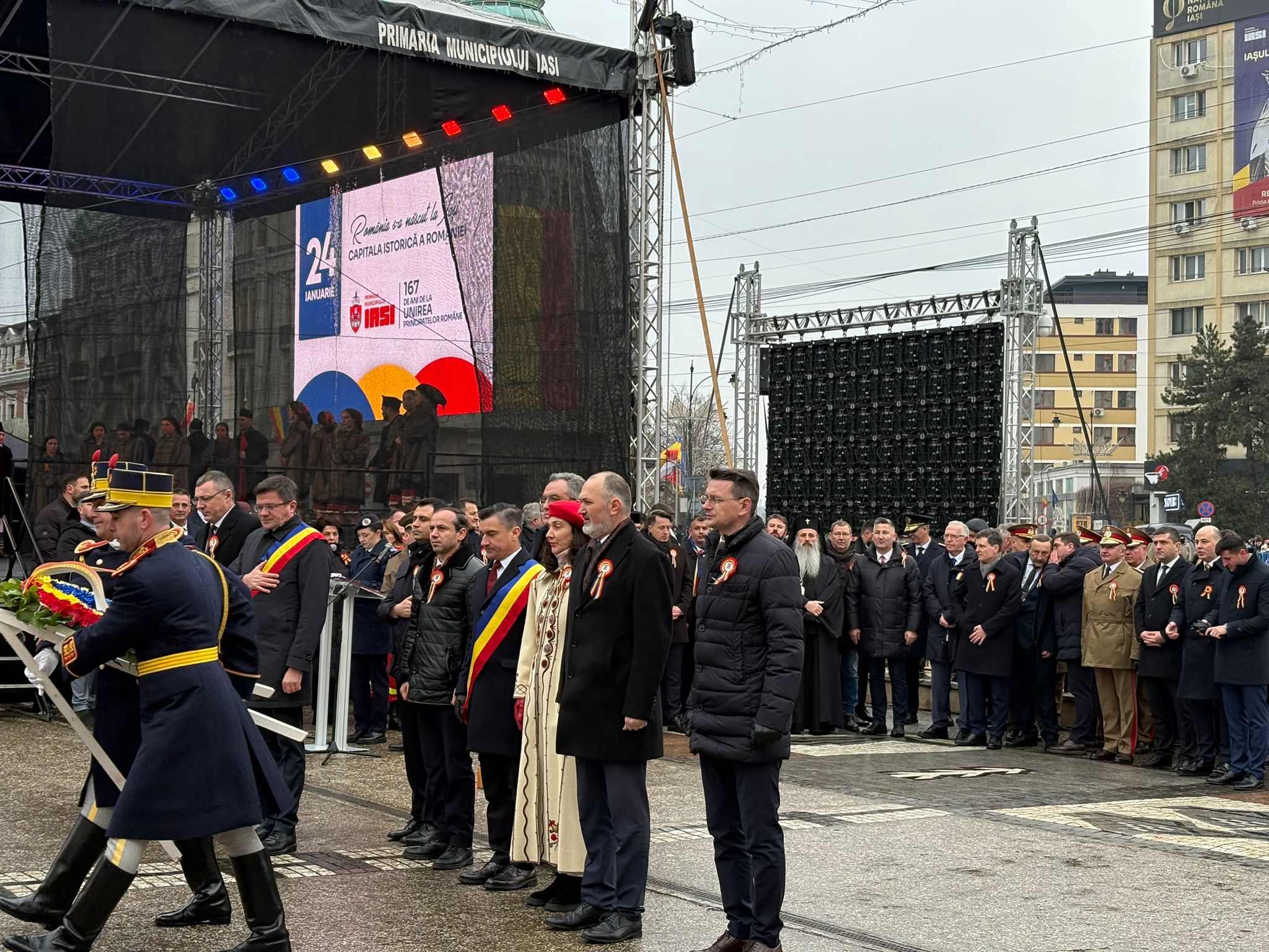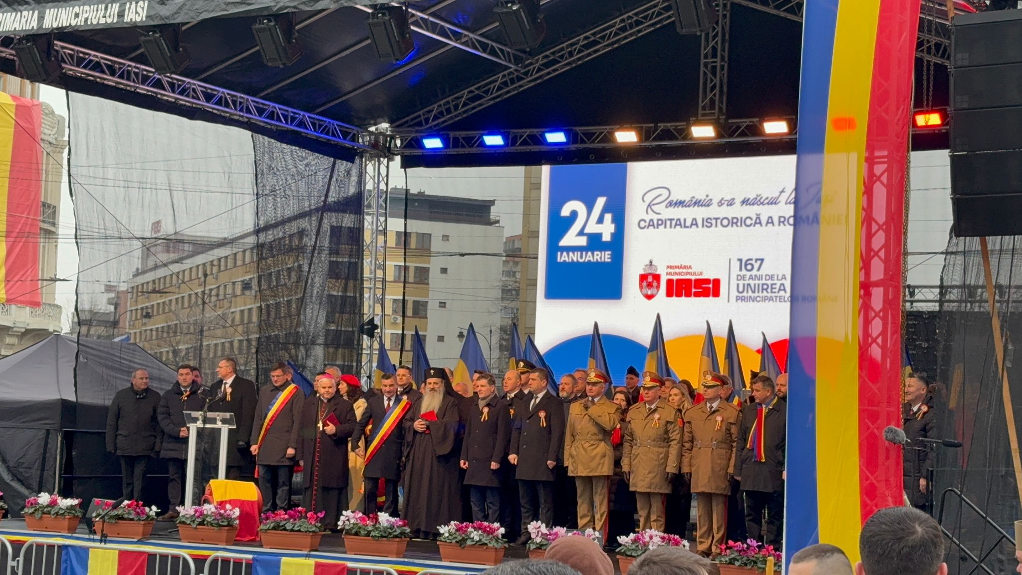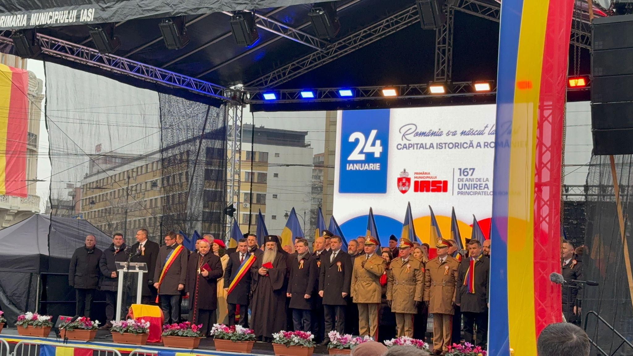 Președintele României, Nicușor Dan, a fost prezent la Iași, cu prilejul ceremoniilor organizate la împlinirea a 167 de ani de la Unirea Principatelor Române. Acesta a fost însoțit de ministrul Apărării, Radu Miruță, și de șeful Statului Major al Apărării, generalul Gheorghiță Vlad. Ceremoniile au început la ora 15.00, când Garda de Onoare i-a dat onorul președintelui, fiind urmate de intonarea Imnului național și de serviciul divin. În Piața Unirii, unde a avut loc manifestarea, au fost prezenți și numeroși susținători ai partidului S.O.S România, care au scandat atât în timpul intonării Imnului național, cât și pe durata ceremoniilor religioase și a discursurilor rostite de oficialități.