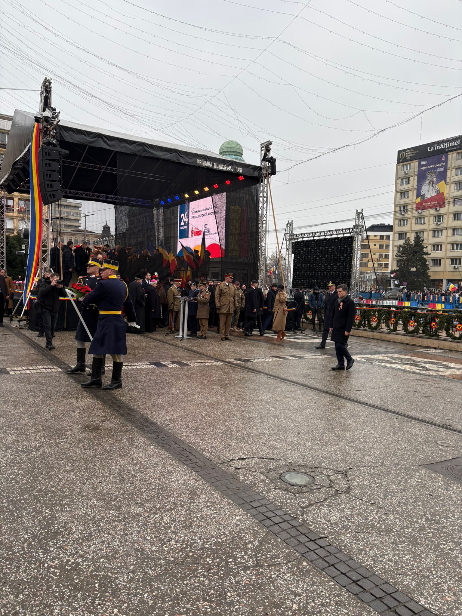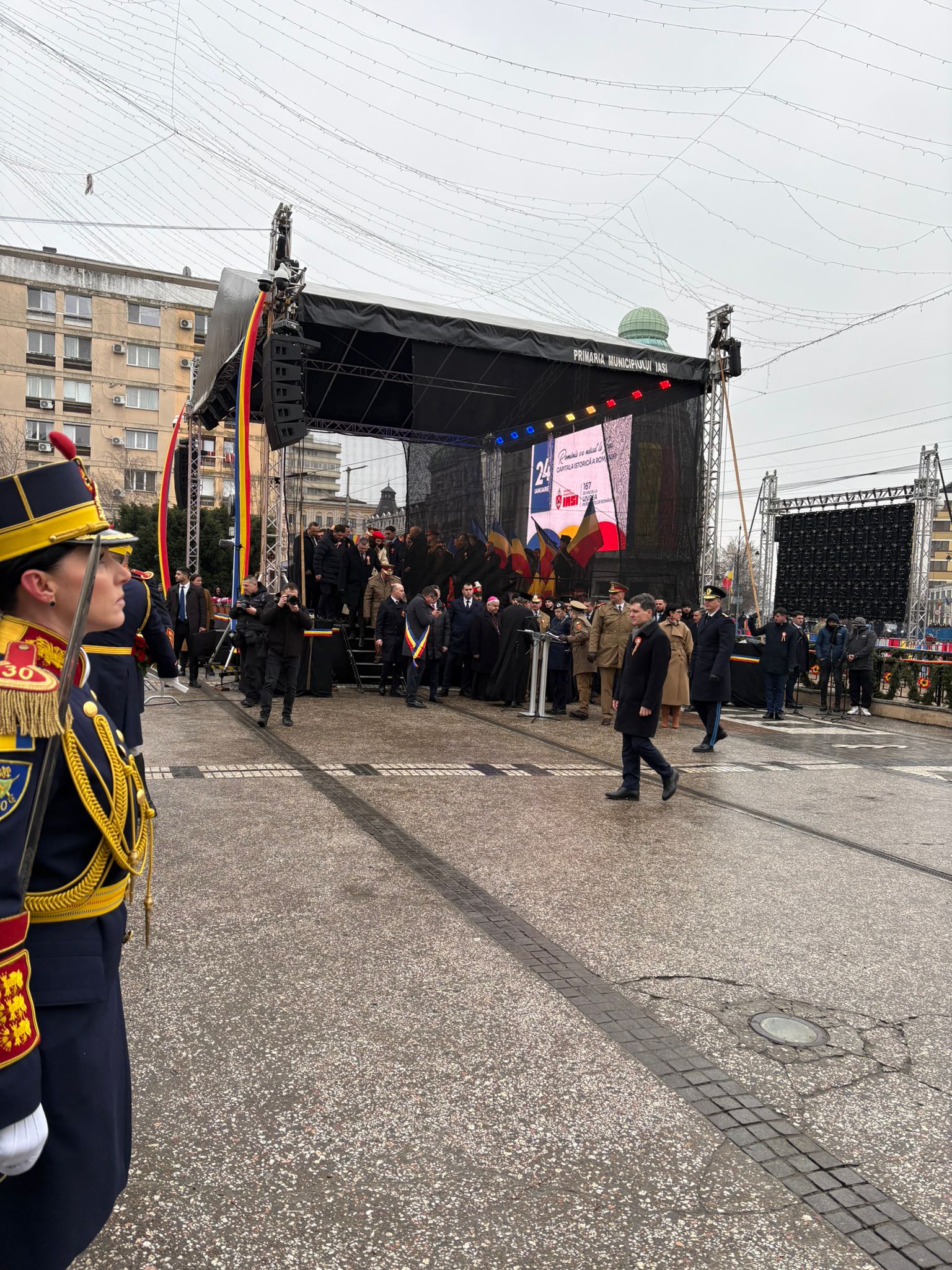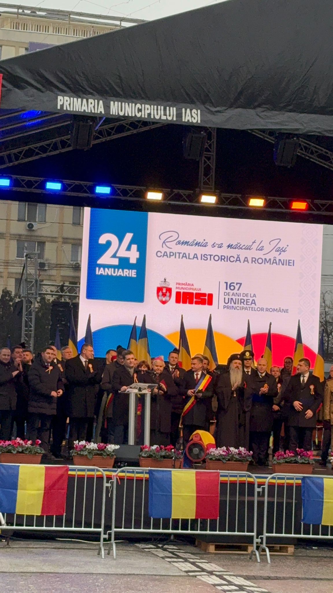 Președintele României, Nicușor Dan, a fost prezent la Iași, cu prilejul ceremoniilor organizate la împlinirea a 167 de ani de la Unirea Principatelor Române. Acesta a fost însoțit de ministrul Apărării, Radu Miruță, și de șeful Statului Major al Apărării, generalul Gheorghiță Vlad. Ceremoniile au început la ora 15.00, când Garda de Onoare i-a dat onorul președintelui, fiind urmate de intonarea Imnului național și de serviciul divin. În Piața Unirii, unde a avut loc manifestarea, au fost prezenți și numeroși susținători ai partidului S.O.S România, care au scandat atât în timpul intonării Imnului național, cât și pe durata ceremoniilor religioase și a discursurilor rostite de oficialități.