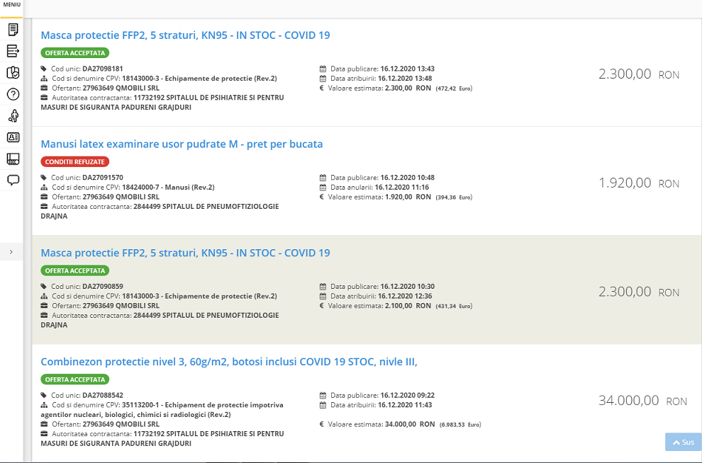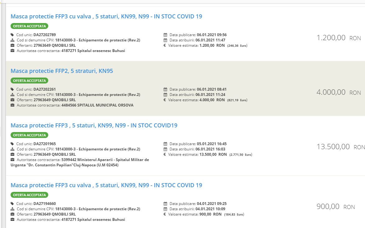 După cum spuneam afacerile acestei firme au cunoscut o crestere exploziva dar deocamdata in editia de astazi ne vom limita in a prezenta doar cateva din achizitiile importante de măști efectuate prin procedura cumpărării directe, din catalogul electronic asa cum sunt prezentate in SEAP. De exemplu, pe data de 8 aprilie 2020 Spitalul de Recuperare din Iași a cumpărat de la această firmă măști de protecție in valoare de 87.750 lei fara TVA. Pe data de 14 aprilie 2020, Unitatea Militara 01158 a Ministerului Apararii a cumpara manusi de 35.000 lei. Anterior, pe 31 martie Serviciul de Ambulanta Bihor cumpărase măști de protecție de 260.000 lei. Cu o zi inainte Spitalul de Căi Ferate din Galati a cumparat măști de protecție de 58.800 lei. Pe 29 Spitalul Clinic de Recuperare din Cluj a cumpărat măști de 13.000 lei. Pe data de 26 martie Spitalul de Psihiatrie Sfantul Pantelimon din Brăila a cumpărat măști de 13.000 lei. Exemplele pot continua. Si in anul 2021 firma pare să-și continue afacerile in acelasi ritm. Deja in ianuarie 2021, 2 spitale si o unitate militara au incheiat contracte pentru achizitii de masti Covid cu aceasta firma.