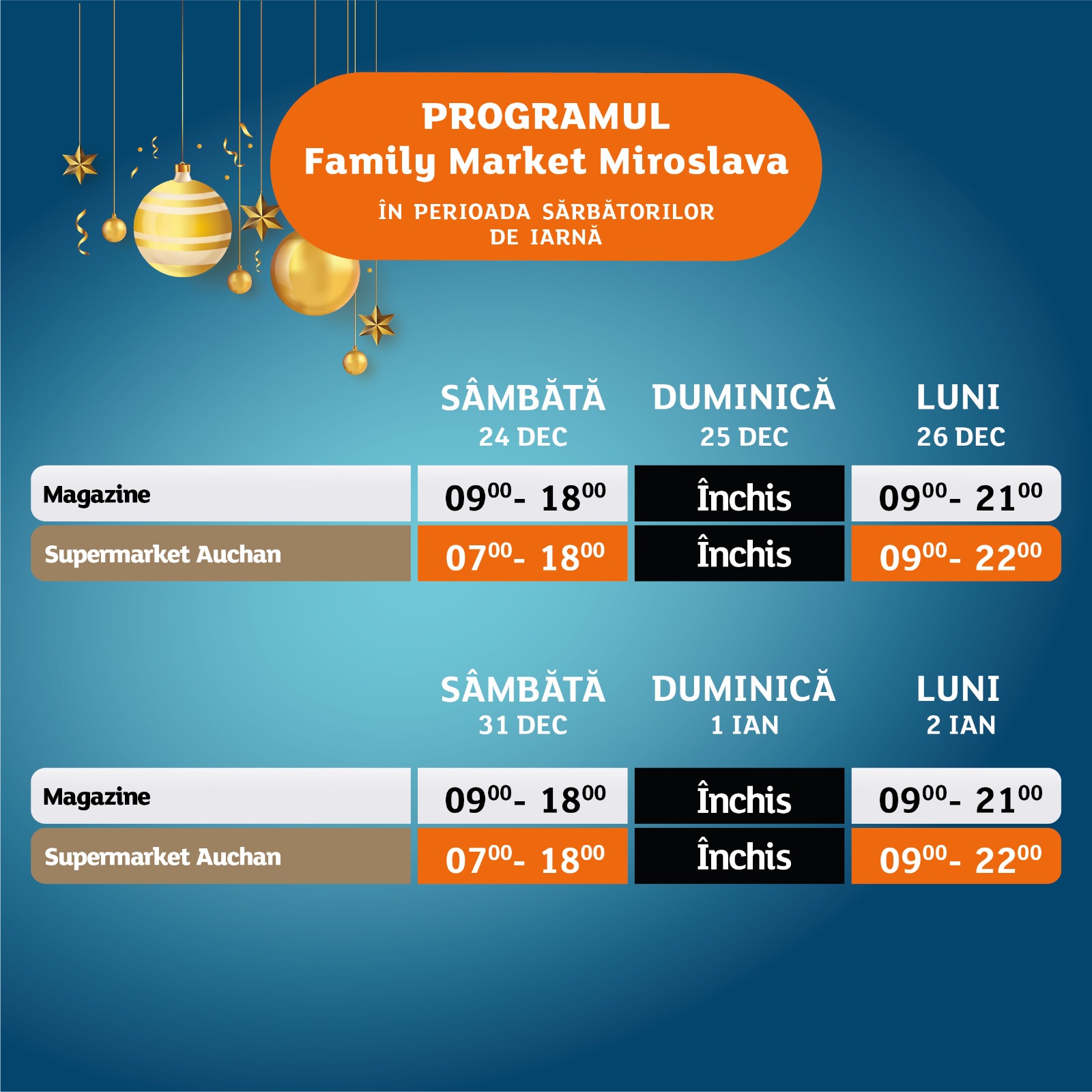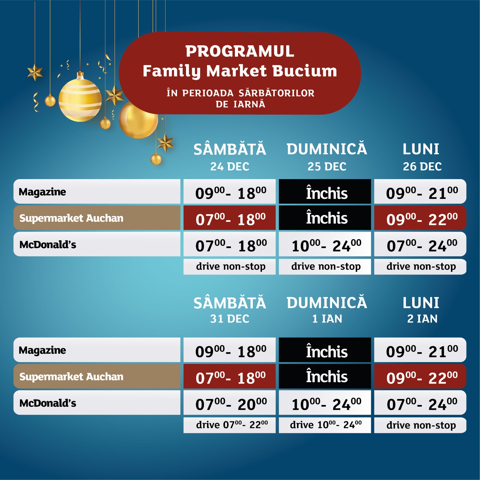 La Family Market, Bucium şi Miroslava, pe 24 și 31 decembrie, programul magazinelor este între orele 09.00 – 18.00. Cumpărăturile pentru mesele de sărbători pot fi făcute şi la Auchan, în intervalul orar 07.00 – 18.00. În prima zi de Crăciun şi în prima zi din 2023 stăm cu cei dragi, dar pe 26 decembrie și pe 2 ianuarie 2023, programul Family Market și cel al supermarket-ului Auchan va reveni la cel obişnuit: 09.00 – 21.00, respectiv 07.00 – 22.00. Dacă îţi va fi poftă de un meniu Big Mac, află că Mc Donald`s Drive Thru din Family Market Bucium va funcționa zilnic, non-stop, în zilele de Crăciun, însă pe 31 decembrie te așteaptă de la ora 07.00 până la 22.00, iar pe 1 ianuarie, de la ora 10.00 până la 24.00. Restaurantul va fi deschis pe 24 decembrie între orele 07.00 – 18.00. În prima zi de Crăciun şi în prima zi din 2023, Mc Donald`s te aşteaptă în intervalul 10.00 – 24.00. Pe 26 decembrie şi pe 2 ianuarie 2023, restaurantul se deschide mai devreme, de la ora 07.00, şi va funcţiona până la ora 24.00. În ultima zi din 2022, preparatele pe care le îndrăgeşti atât de mult pot fi savurate de la ora 07.00 până la ora 20.00.