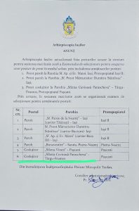 Anunț privind scoaterea la concurs a postului de preot coslujitor – Parohia „Sfânta Cuvioasă Parascheva” din Târgu Frumos