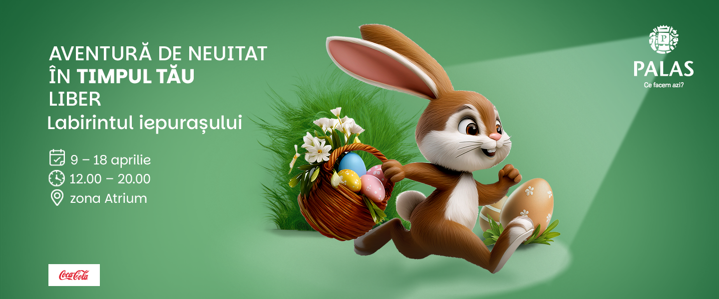 De miercuri, 9 aprilie 2025, și până pe data de 18 aprilie 2025, în intervalul orar 12:00-20.00, cei mici sunt invitați în Atrium pentru o cursă simpatică alături de personajele urecheate, doamna și domnul Iepuraș. Aceștia îi însoțesc pe copii în grădina labirint, locul în care cei mici își dezvoltă imaginația, află povești din lumea fascinantă a unor personaje, socializează și caută indicii. În căutarea ouălor de Paște, micuții colorează cartea Palas și primesc, la finalul cursei, cadouri dulci de sezon. Accesul se realizează pe bază de bilet, care poate fi achiziționat de la Centrul Informațional (intrarea dinspre Palatul Culturii).