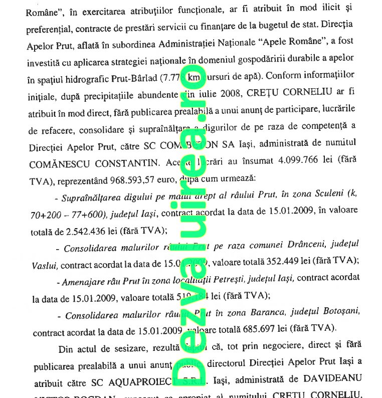 Potrivit ordonantei, ancheta a demarat la data de 6 ianuarie 2010 cand procurorii DNA Iasi s-au sesizat din oficiu cu privire la faptul ca fostul director al Directiei de Ape Prut ar fi atribuit in mod preferential, fara licitatie, firmei Com Beton, patronate de afaceristul Constantin Comanescu, dupa inundatiile din 2008, lucrari de refacere, suprainaltare si consolidare a raului Prut. Valoarea lucrarilor obtinute astfel de firma Com- Beton ar fi fost de 4.099.766 lei adica 968.593 euro fara TVA. De fapt, dupa cum am mai spus, DNA s-a sesizat dupa aparitia in presa locala iesena a unor articole in care se prezentau neregulile cu privire la contractele de achizitii publice incheiate de Directia de Ape Prut. Este vorba despre „Suprainaltarea digului pe malul drept al raului Prut in zona Sculeni, judetul Iasi” pe o lungime de 11,3 km de metri contract acordat la data de 15.01.2009 avand o valoare de 2.542.436 fara TVA; „Consolidarea malurilor raului Prut pe raza comunei Dranceni, judetul Vaslui; contract acordat la data de 15.01.2009 cu o valoare totala de 352.449 lei fara TVA; „Consolidarea malurilor raului Prut in zona Baranca judetul Botosani”, contract acordat la data de 15.01.2009 cu o valoare de 685.697 lei fara TVA; In plus in actul de sesizare a mai fost cuprins faptul ca firma lui Bogdan Davideanu, fostul director al Agentiei de Protectie a Mediului, Aquaproiect SRL ar fi obtinut de la Directia de Ape Prut lucrari in valoare de 85.000 euro tot fara licitatie.