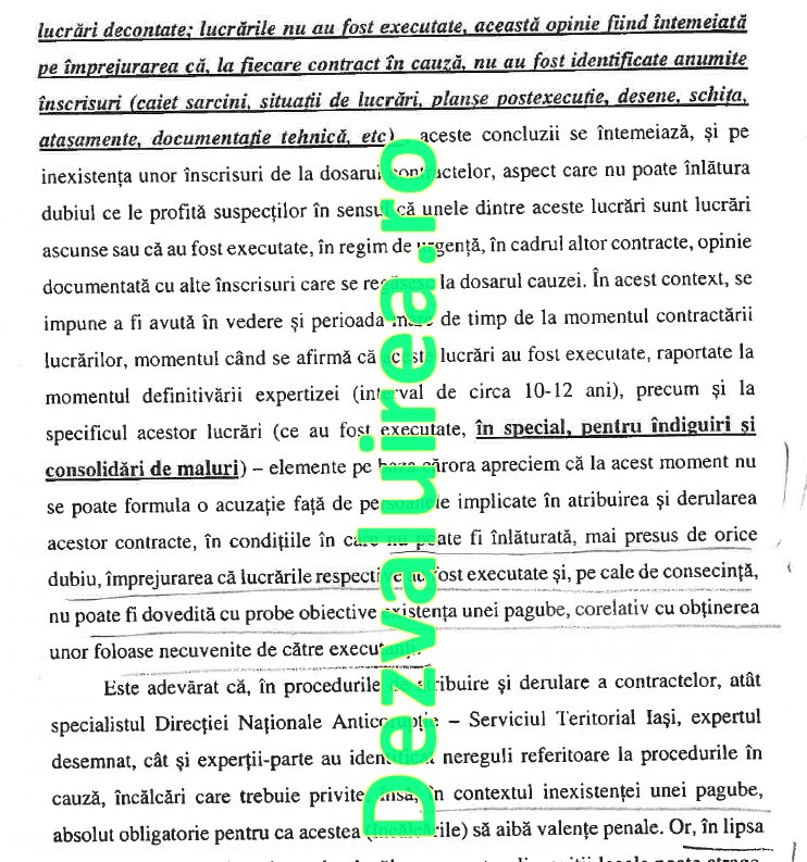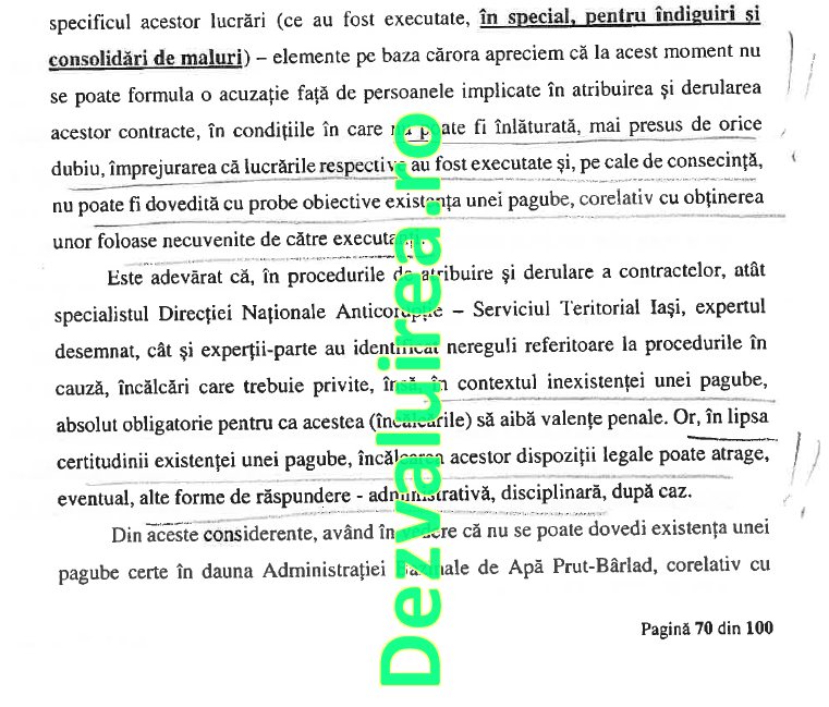 Alina Moraru isi argumenteaza decizia de clasare cu ajutorul ultimelor doua expertize care ar oferi date neconcludente pentru stabilirea unui prejudiciu. „In acest context se impune a fi avuta in vedere si perioada mare de timp de la momentul contractarii lucrarilor, momentul cand se afirma ca aceste lucrari au fost executate, raportate la momentul definitivarii expertizei (10 – 12 ani) precum si specificul acestor lucrari (ce au fost executate, in special pentru indiguiri si consolidari maluri ) elemente pe baza carora apreciem ca la un moment dat nu se poate formula o acuzatie fata de persoanele implicate in atribuirea si derularea acestor contracte in conditiile in conditiile in care nu poate fi inlaturata mai presus de orice dubiu, imprejurarea ca lucrarile respective au fost executate si pe cale se consecinta nu poate fi dovedita cu probe obiective existenta unei pagube, corelativ cu obtinerea unor foloase necuvenite de catre executanti”, arata sefa DNA Iasi, Alina Moraru in ordonanta de clasare.