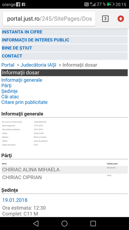 Pe data de 19 ianuarie a.c Alina Chiriac a depus o cerere de prelungire a ordinului de protective dar judecatorii nu au fost de acord. Asta in condtitiile in care femeia a aratat ca a fost urmarita de fostul sot. In plus femeia a aratat ca sotul a incalcat primul ordin de protectie. In plus potrivit unor surse din anturajul victimei femeia a depus impotriva politistului si o plangere penala la Parchetul de pe langa Judecatoria Iasi. Fotografia publicata de Dezvaluirea.ro a fost facuta in timp ce Alina si Ciprian Chiriac participau la o nunta, in perioda in care se intelegeau. Cei doi au impreuna o fetita care merge la gradinita. Potrivit declaratiilor de avere cei doi soti care in present sunt in divort au impreuna un apartament cumparat cu ajutorul unui credit bancar si un autoturism Logan.
