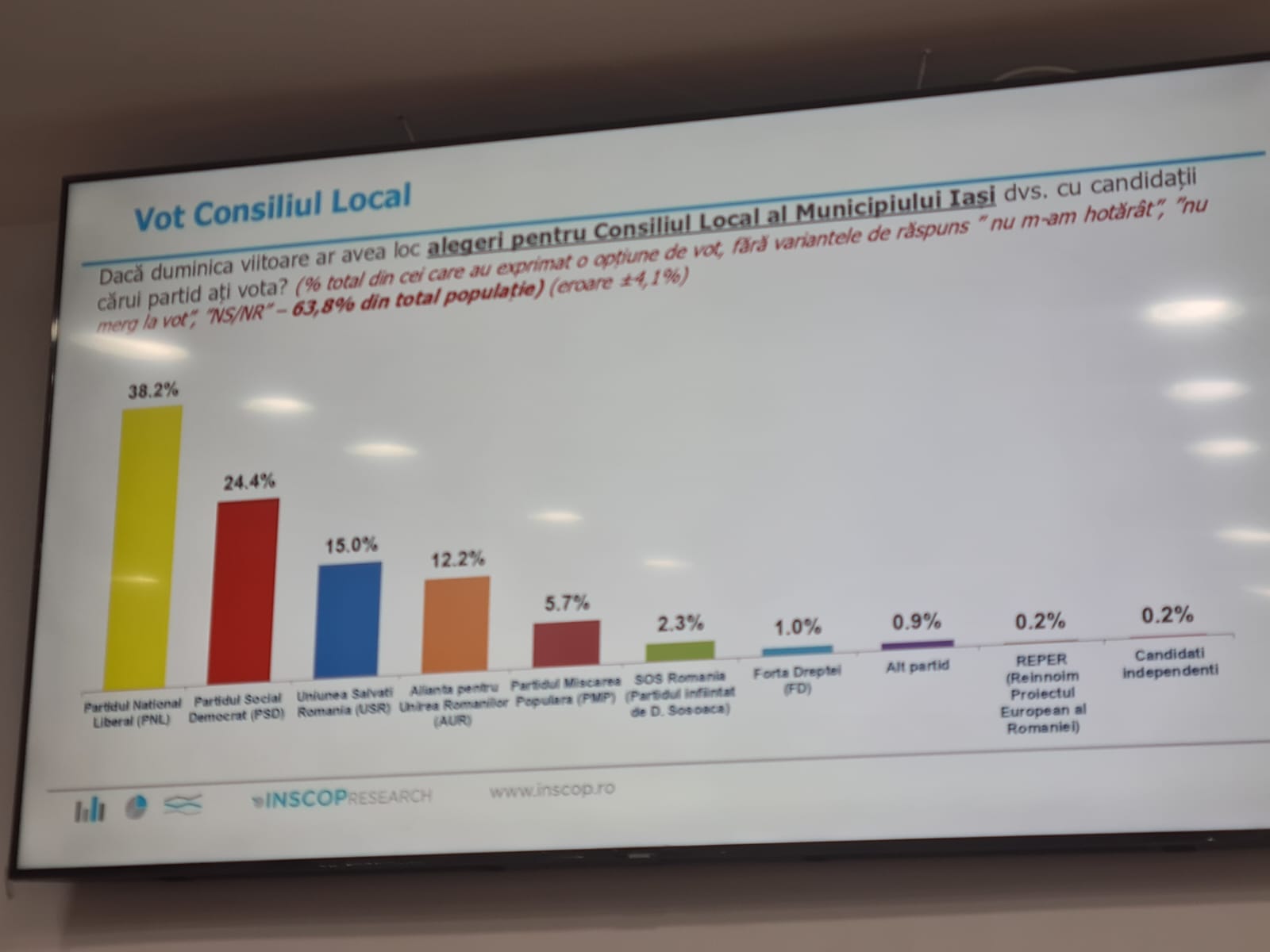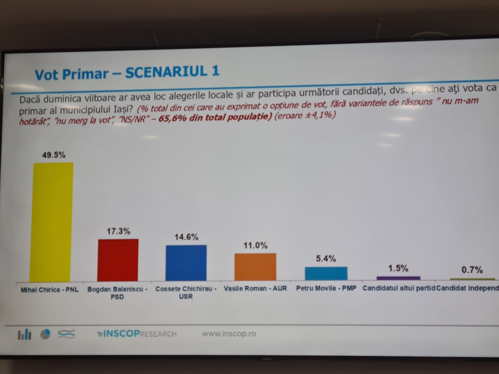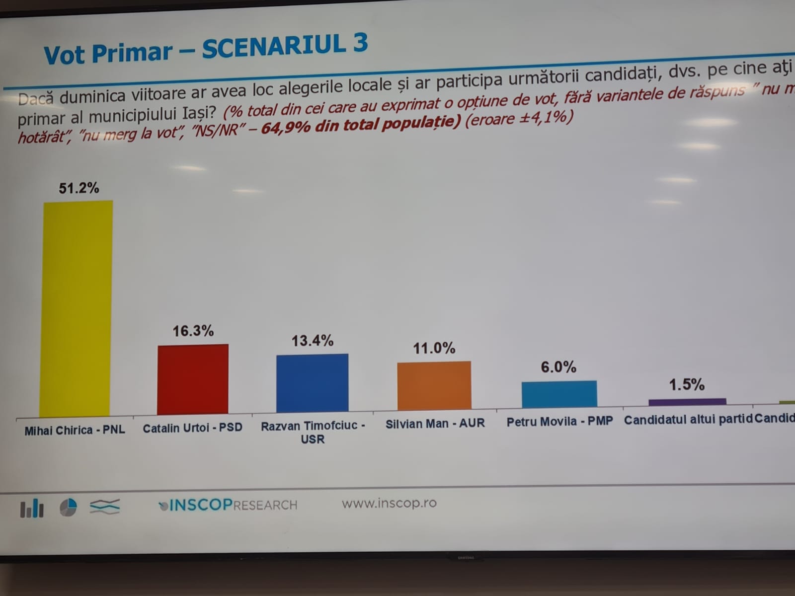 Un sondaj prezentat astazi de presedintele PNL Iași, Alexandru Muraru arată ca liberalii ar castiga alegerile locale daca scrutinul s-ar ține in aceasta perioada. De precizat ca la acest sondaj au răspuns numai cetățeni din municipiul Iași. Astfel, potrivit acestui sondaj, pentru ocuparea fotoliului de primar, Mihai Chirica conduce in preferintele electoratului fiind cotat cu un procent de 50 la suta. Pe locul doi este clasat candidatul PSD, Bogdan Balanișcu cu un procent de 17,3 la sută. De asemenea daca ar candida de la PSD, Catalin Urtoi ar obține 16,3 la sută. Candidații USR se află pe locul 3 fiind cotați cu procente cuprinse între 13-16 la sută. De asemenea pentru functia de presedinte al Consiliului Județean, actualul presedinte Costel Alexe conduce detașat in preferintele iesenilor fiind cotat cu 36,4 la sută în timp ce candidatul PSD, fostul presedinte Maricel Popa este cotat cu numai 22,3 la sută. De observat ca, daca de la PSD ar candida consilierul județean Cristian Stanciu acesta ar obține 21 la sută. De asemenea, daca in aceasta perioada ar avea loc alegeri parlamentare iesenii ar vota PNL in procent de 36,4 la sută. În tabelele atașate acestui text pot fi vazute celelalte date din sondaj. La conferinta de presa a participat și Lucian Rusu noul secretar general adjunct al Guvernului care a promis ca din pozitia obtinuta va sprijini toate proiectele Iașului.