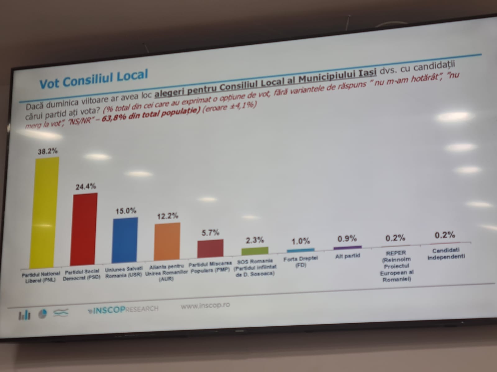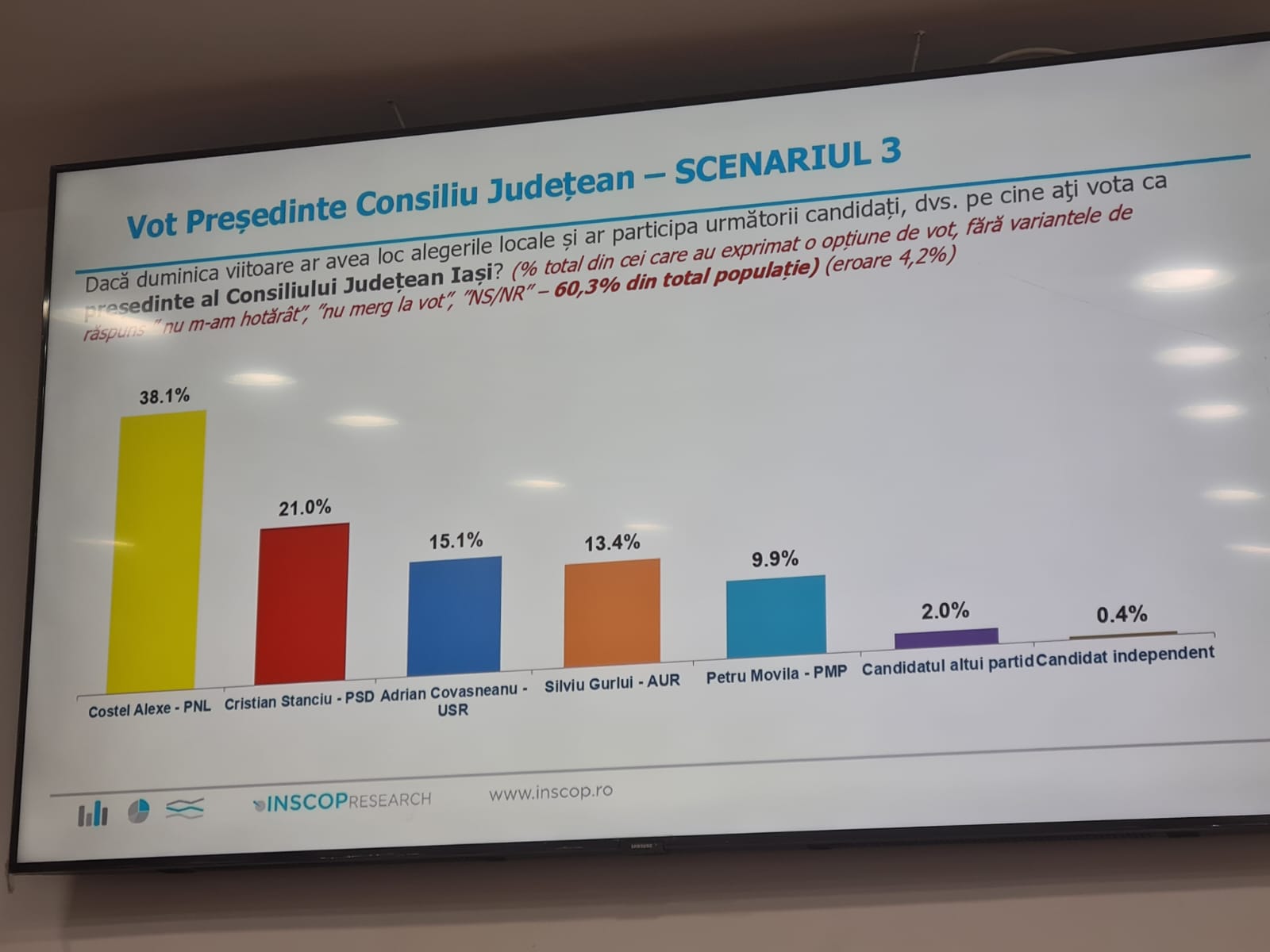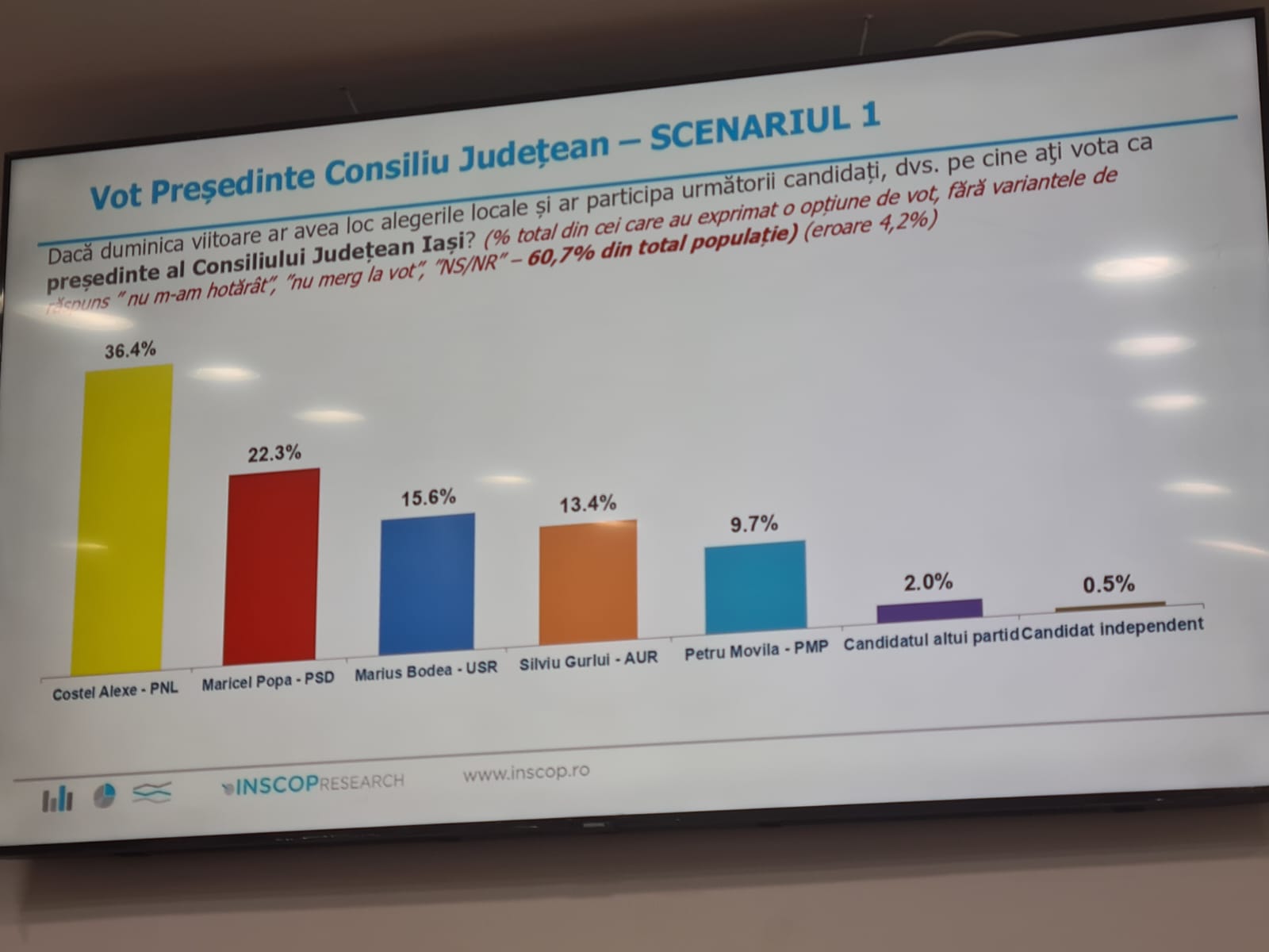 Un sondaj prezentat astazi de presedintele PNL Iași, Alexandru Muraru arată ca liberalii ar castiga alegerile locale daca scrutinul s-ar ține in aceasta perioada. De precizat ca la acest sondaj au răspuns numai cetățeni din municipiul Iași. Astfel, potrivit acestui sondaj, pentru ocuparea fotoliului de primar, Mihai Chirica conduce in preferintele electoratului fiind cotat cu un procent de 50 la suta. Pe locul doi este clasat candidatul PSD, Bogdan Balanișcu cu un procent de 17,3 la sută. De asemenea daca ar candida de la PSD, Catalin Urtoi ar obține 16,3 la sută. Candidații USR se află pe locul 3 fiind cotați cu procente cuprinse între 13-16 la sută. De asemenea pentru functia de presedinte al Consiliului Județean, actualul presedinte Costel Alexe conduce detașat in preferintele iesenilor fiind cotat cu 36,4 la sută în timp ce candidatul PSD, fostul presedinte Maricel Popa este cotat cu numai 22,3 la sută. De observat ca, daca de la PSD ar candida consilierul județean Cristian Stanciu acesta ar obține 21 la sută. De asemenea, daca in aceasta perioada ar avea loc alegeri parlamentare iesenii ar vota PNL in procent de 36,4 la sută. În tabelele atașate acestui text pot fi vazute celelalte date din sondaj. La conferinta de presa a participat și Lucian Rusu noul secretar general adjunct al Guvernului care a promis ca din pozitia obtinuta va sprijini toate proiectele Iașului.