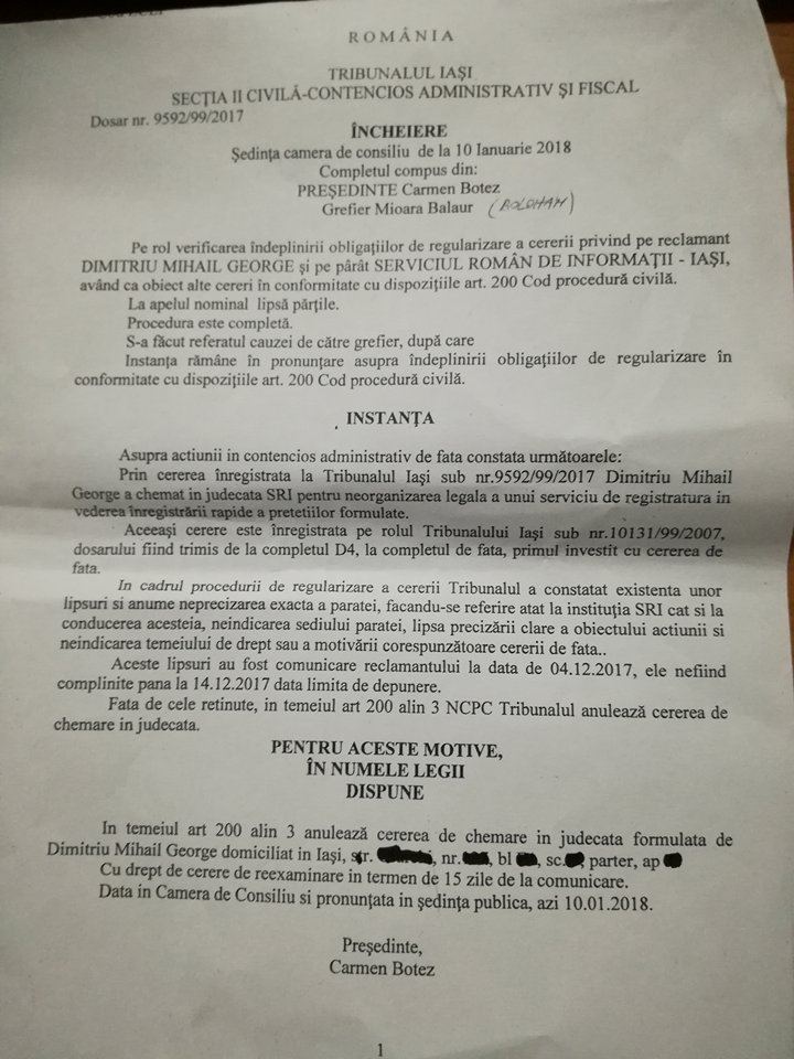 Magistratii ieseni au respins cererea ieseanului pe motiv ca este foarte vaga si pentru ca nu a indicat printre altele adresa SRI. „In cadrul procedurii de regularizare a cererii Tribunalul a constatat existenta unor lipsuri si anume neprecizarea exacta a paratei, facandu-se referire atat la institutia SRI cat si la conducerea acesteia, neindicarea sedilui paratei, lipsa precizarii clare a obiectului actiunii si neindicarea temeiului de drept sau a motivarii corespunzatoare cererii de fata”, au aratat judecatorii in decizia de respingere a uneia dintre cereri. Intr-o alta sentinta magistratii i-au solicitat lui Mihail George Dimitriu sa plateasca o taxa de timbru de 20 lei. S-ar parea ca ieseanul care locuieste in cartierul Tatarasi din municipiul Iasi nu vrea sa renunte cu una cu doua. Acesta a depus si o plangere penala inregistrata la Parchetul Militar cu nr.211/8/1/2017. Potrivit site-ului SRI cetatenii pot lua legatura cu reprezentantii institutiei prin telefon prin e-mail sau cu ajutorul serviciilor postale. „Sectorul Relaţii cu cetăţenii poate fi contactat la numerele de telefon 0377.723.671 şi 0785.259.748, fax 0377.723.210, pe adresa de e-mail: relatii@sri.ro precum si la adresa b-dul Libertăţii nr. 14,